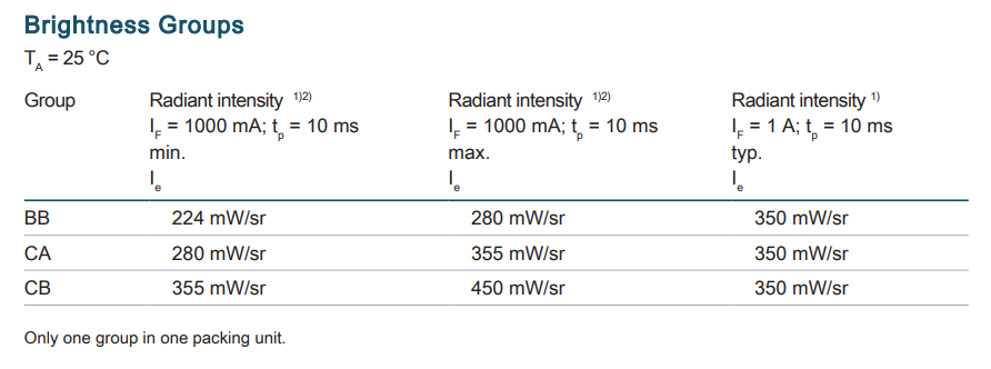 ความเข้มกระจ่างใส @ 25 ℃ @ 1000mA @ 10MS:224-450mW/sr