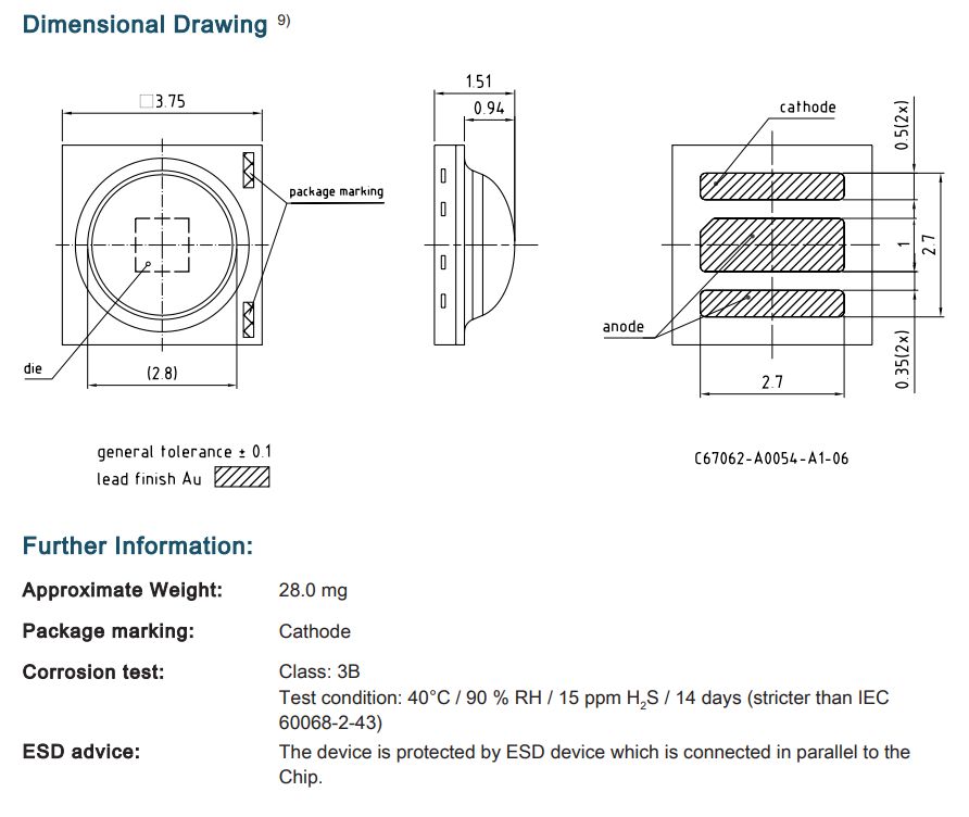 ช่วงแรงดันไฟฟ้าไปข้างหน้า @ 25 ℃ @ 1000mA:3.05-3.35V