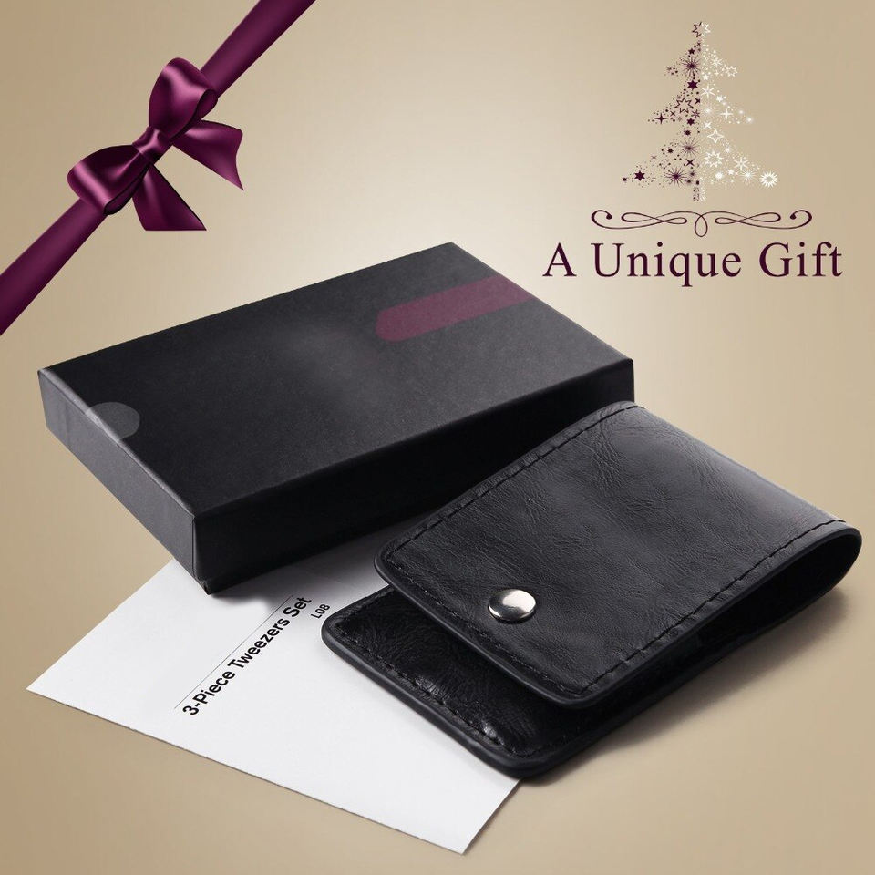 ชุดแหนบคิ้ว3ชิ้นสีโรสโกลด์พร้อมกล่องหนังสำหรับเดินทางชุดเครื่องมือซ่อมแซมซ่อมแซมซ่อมแซมซ่อมแซมซ่อมแซมใบหน้าเครื่องมือกำจัดขนเครื่องมือแต่งหน้า