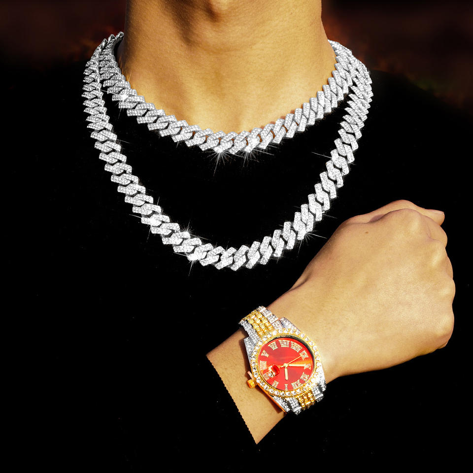 3ชิ้นชุดแฟชั่นคิวบาสร้อยคอมือร็อคลูกอม hoptrend สร้อยคอโซ่ทองขนาดใหญ่บรรยากาศนาฬิกาควอตซ์หน้าปัดใหญ่สำหรับผู้ชาย