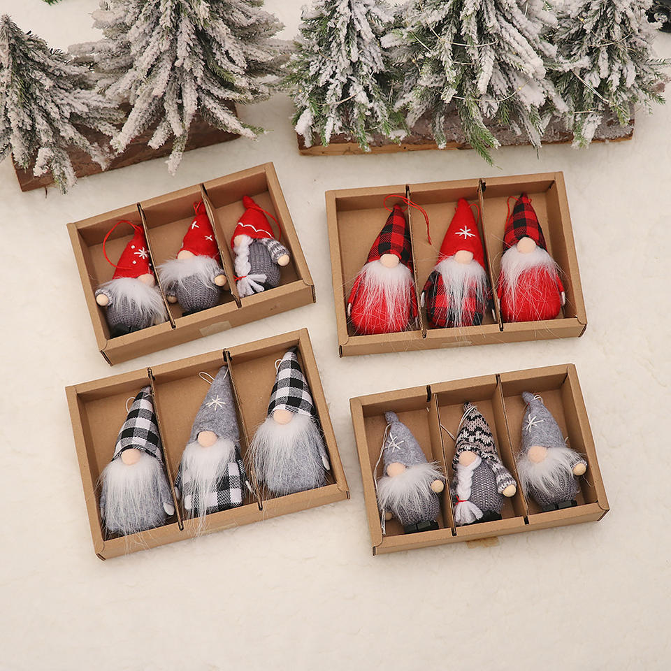 ชุดเครื่องประดับตุ๊กตาไร้หน้า3ชิ้นสำหรับต้นคริสต์มาสกล่องหน้าต่างลายไม้สไตล์สแกนดิเนเวียนสีแดงสีดำ