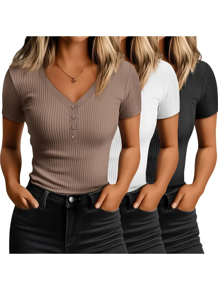 3pcs Women's Short Sleeve T-Shirts Button Knitted Solid Color Casual V Neck 100% Cotton Quick Dry High Quality Regular Fit