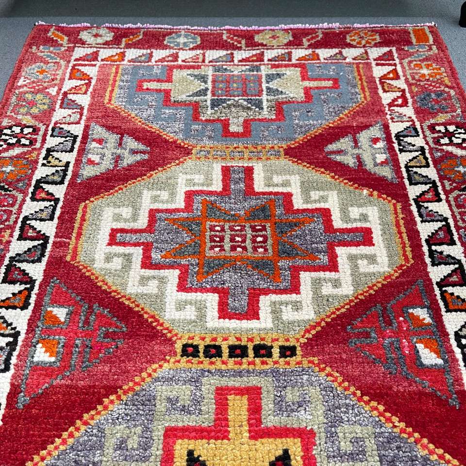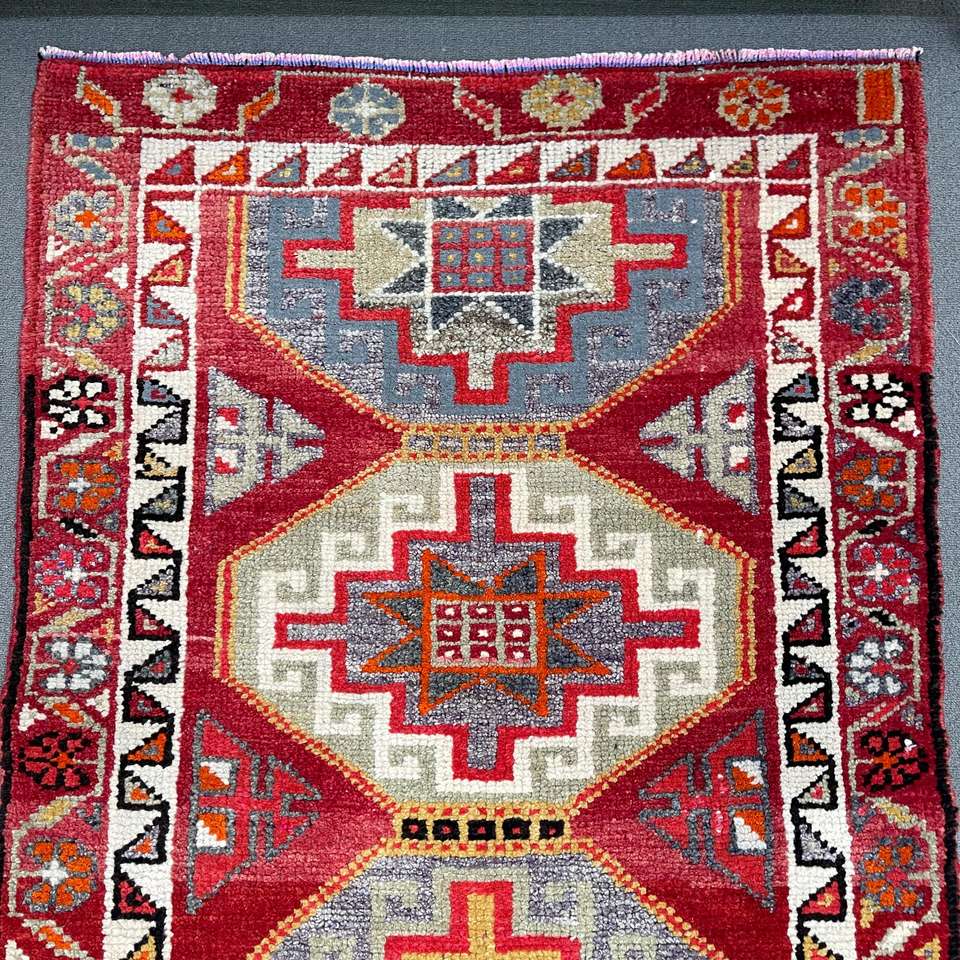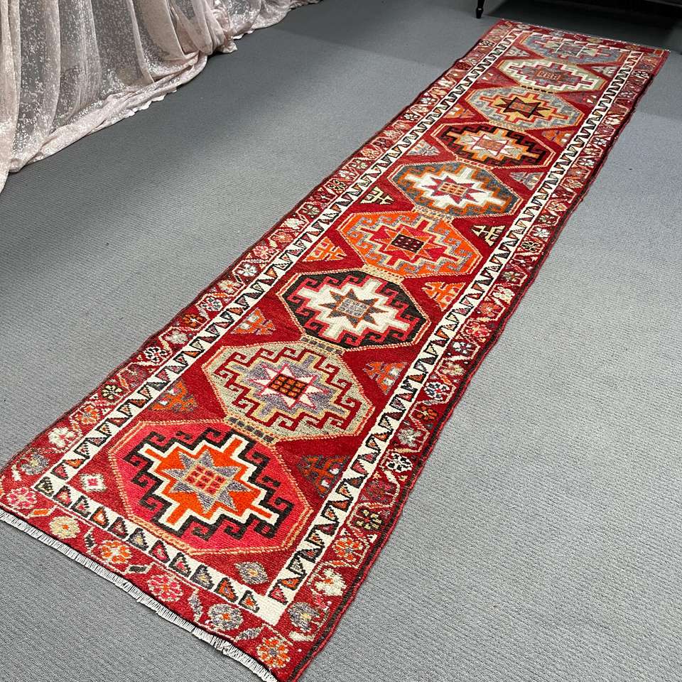3x11.7 ft Turkish Vintage Rug, Runner Rug, Red Check Rug