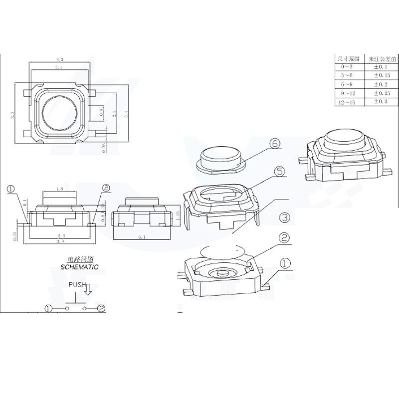 สวิตช์สัมผัสขนาด 3x3x1.5 มม. แบบ 4 ขา กันน้ำ SMD บรรจุแบบเทปและม้วน สำหรับหูฟังบลูทูธ
