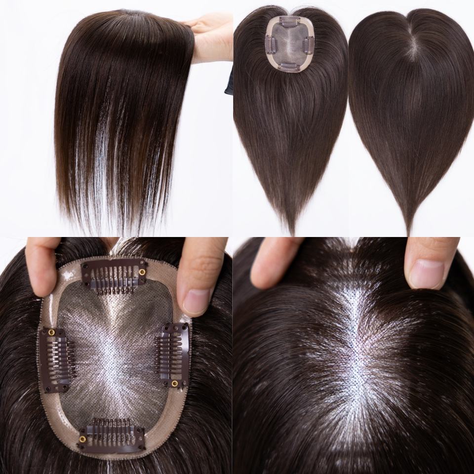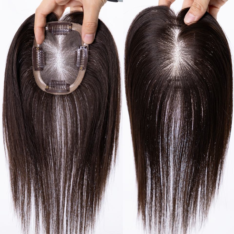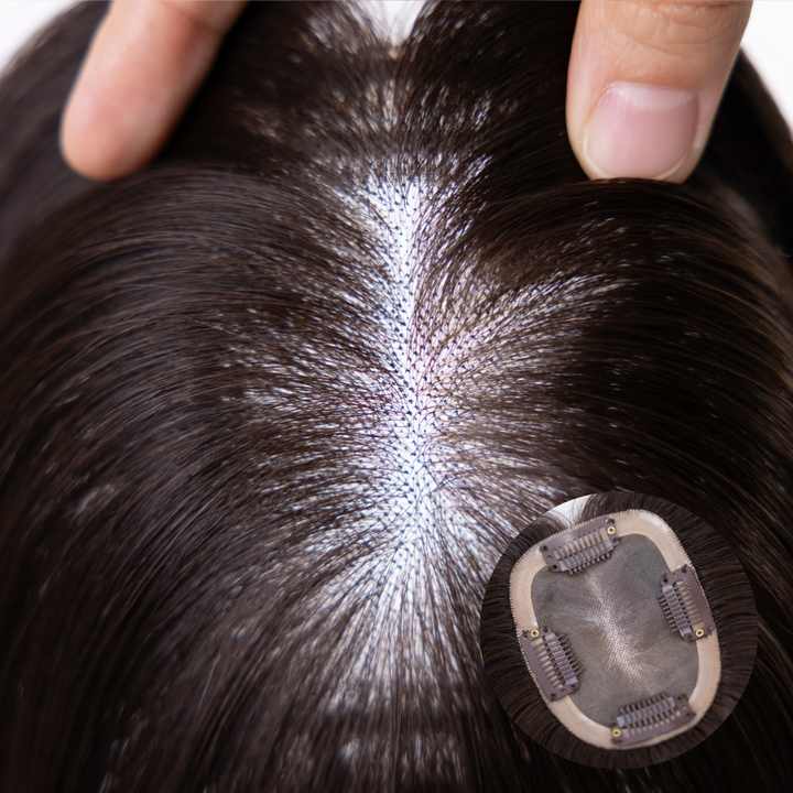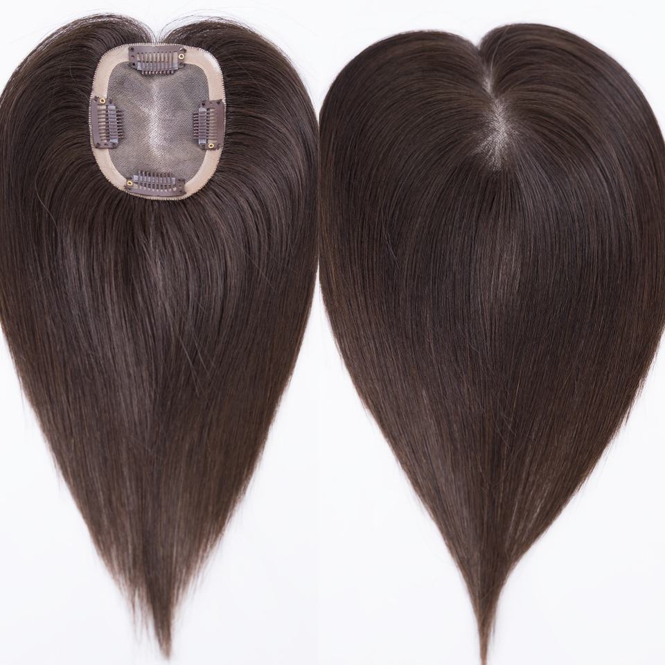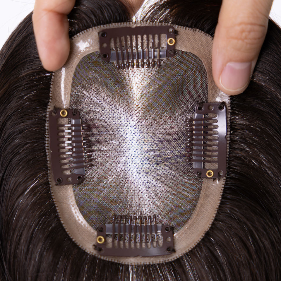 ท็อปเปอร์ผมแบบคลิปหนีบขนาด 3x4 นิ้ว แบบโมโน สำหรับปิดผมบาง/ไรผม มองไม่เห็นรอยต่อ สีน้ำตาลเข้มธรรมชาติ ใช้งานง่ายทุกวัน ผสมผสานกับเส้นผมได้ดี ฐานไหม แบบยุโรป