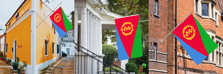 ธงเอริเทรียขนาด 3x5 ฟุต ทำจากโพลีเอสเตอร์ พร้อมห่วงทองเหลืองสองวง ชั้นเดียว สำหรับแขวนตกแต่งภายนอกและภายในอาคาร
