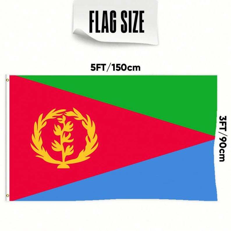 ธงเอริเทรียขนาด 3x5 ฟุต ทำจากโพลีเอสเตอร์ พร้อมห่วงทองเหลืองสองวง ชั้นเดียว สำหรับแขวนตกแต่งภายนอกและภายในอาคาร