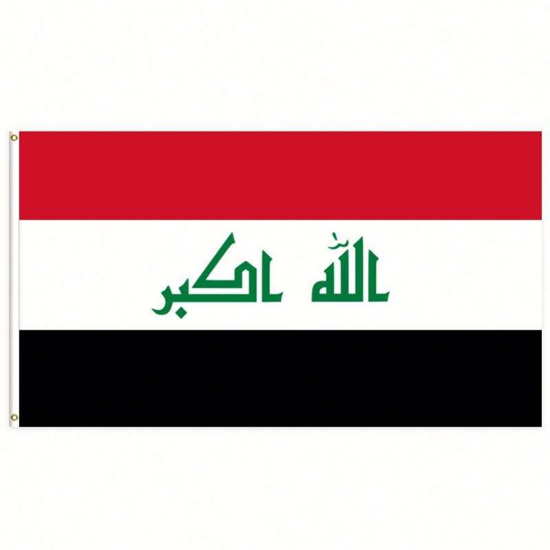 ธงชาติอิรัก ขนาด 3x5 ฟุต ผลิตจากผ้าโพลีเอสเตอร์ พร้อมห่วงทองเหลืองสองวง สำหรับแขวนผนัง ใช้ตกแต่งได้ทั้งภายนอกและภายในอาคาร