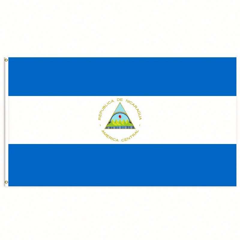 ธงนิการากัวขนาด 3x5 ฟุต ทำจากโพลีเอสเตอร์ พร้อมห่วงทองเหลืองสองวง แบบชั้นเดียว สำหรับแขวนผนัง ตกแต่งภายนอกและภายในอาคาร