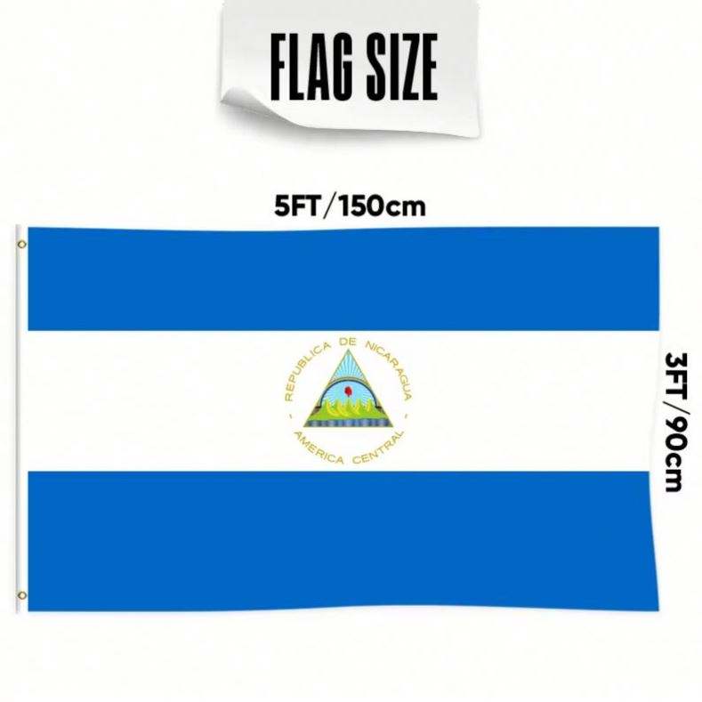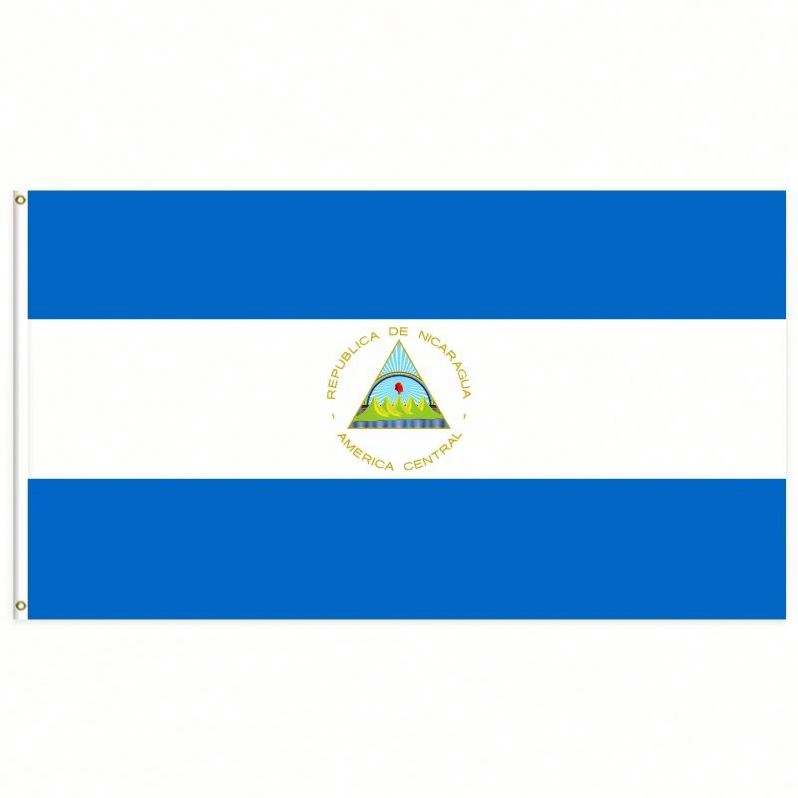 ธงนิการากัวขนาด 3x5 ฟุต ทำจากโพลีเอสเตอร์ พร้อมห่วงทองเหลืองสองวง แบบชั้นเดียว สำหรับแขวนผนัง ตกแต่งภายนอกและภายในอาคาร