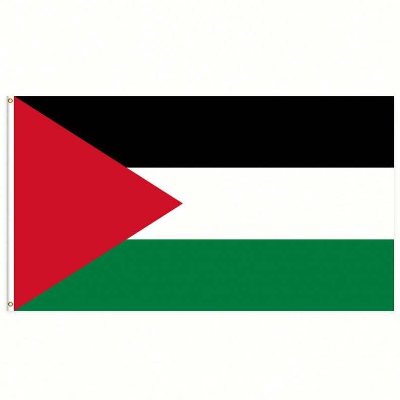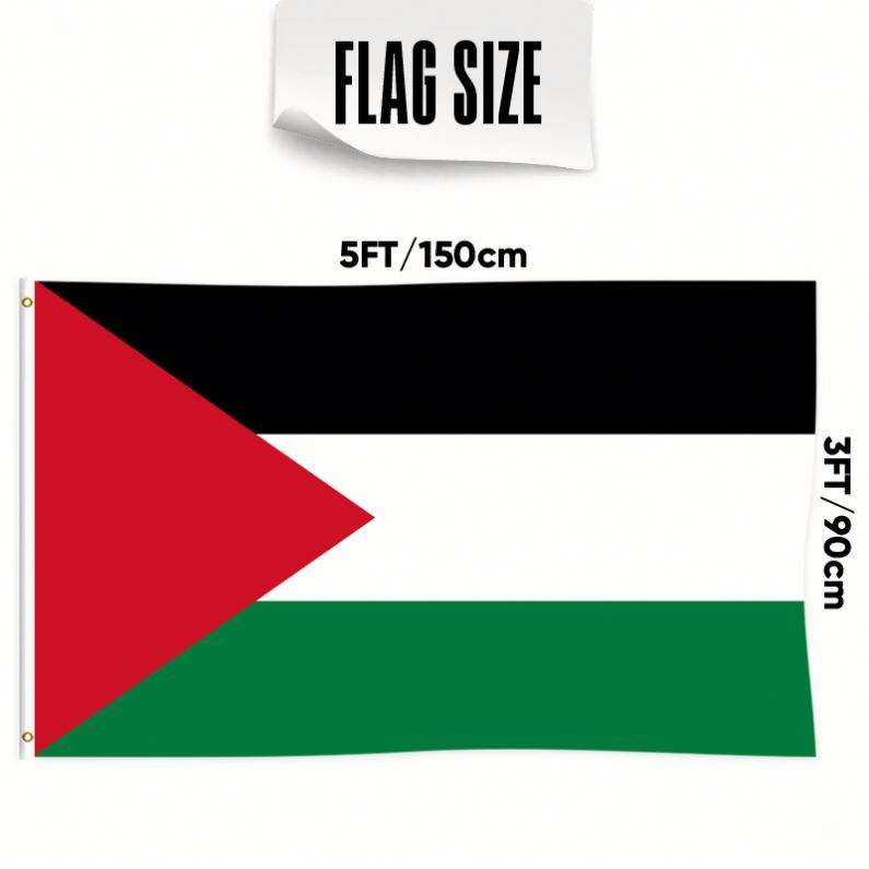 ธงปาเลสไตน์ขนาด 3x5 ฟุต ทำจากโพลีเอสเตอร์ พร้อมห่วงทองเหลืองสองอัน แบบชั้นเดียว สำหรับแขวนผนัง ตกแต่งภายนอกและภายในอาคาร