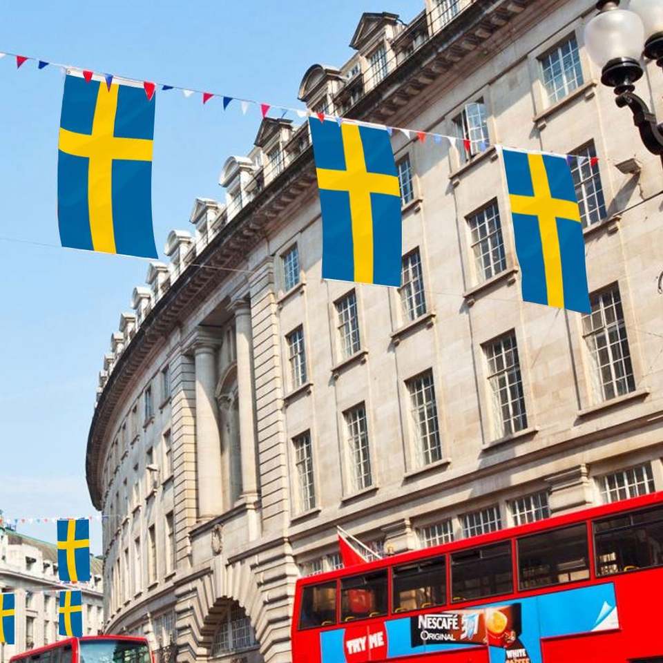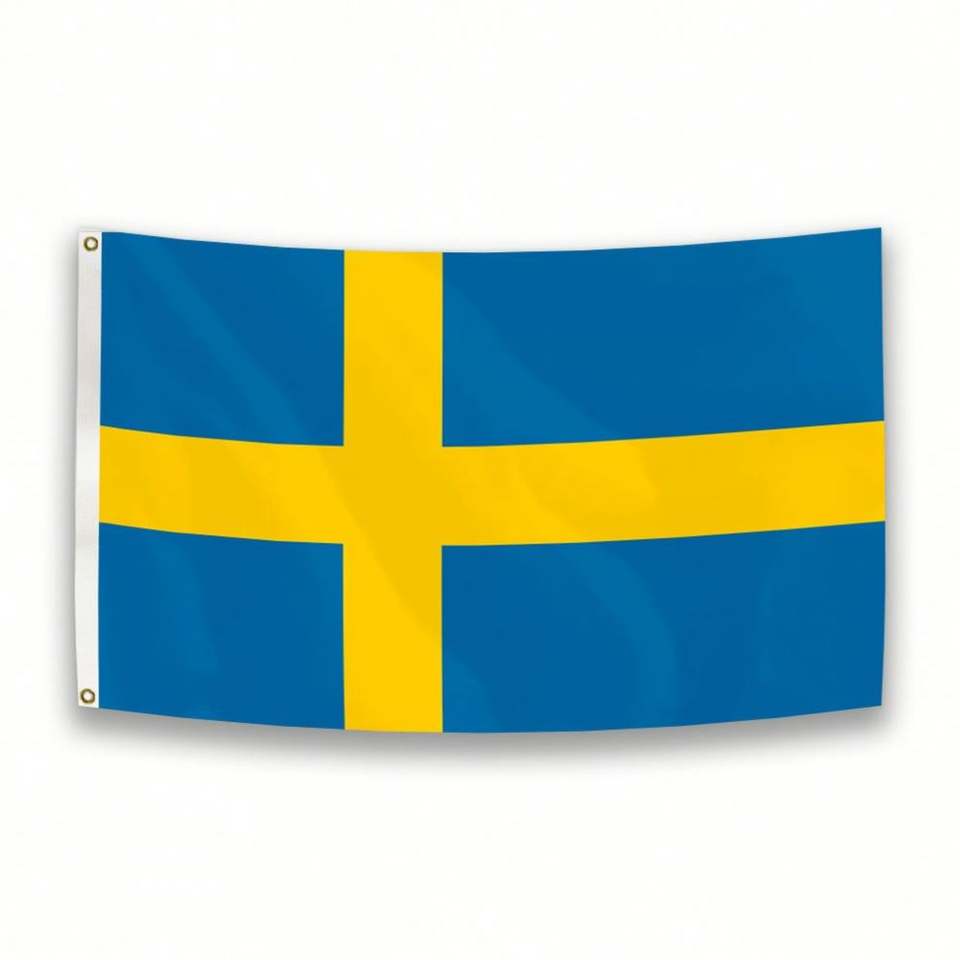 ธงชาติสวีเดนขนาด 3x5 ฟุต ทำจากผ้าโพลีเอสเตอร์ พร้อมห่วงทองเหลืองสองวง สำหรับแขวนผนัง ตกแต่งภายนอกและภายในอาคาร