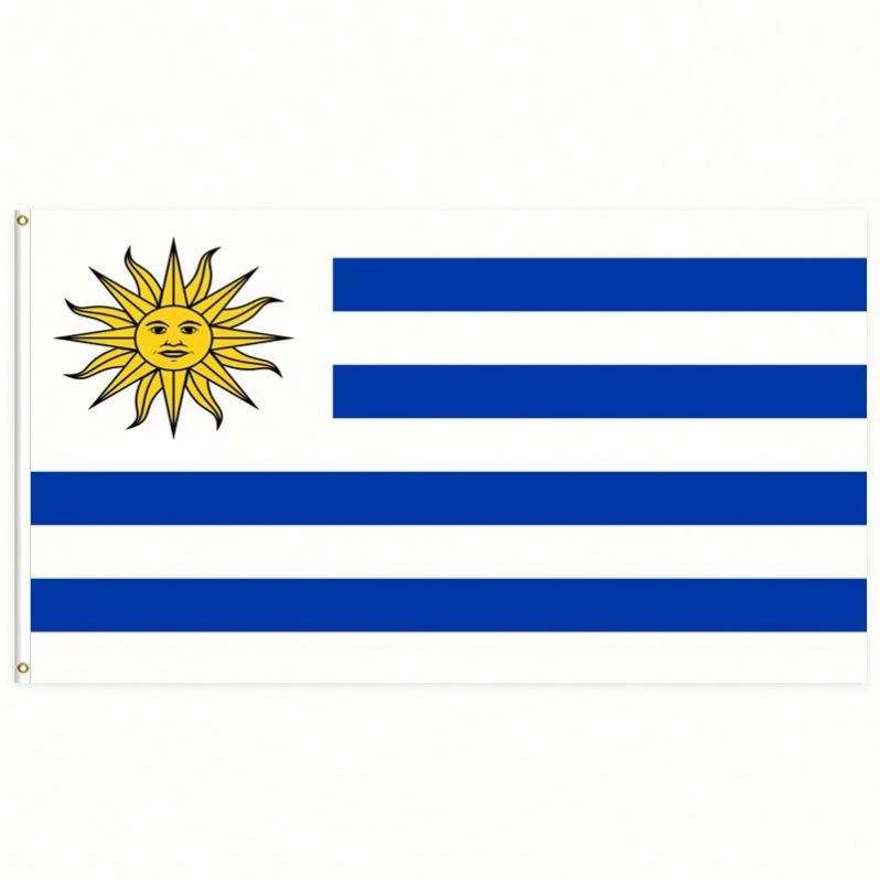 ธงอุรุกวัยขนาด 3x5 ฟุต ทำจากโพลีเอสเตอร์ พร้อมห่วงทองเหลืองสองวง ชั้นเดียว สำหรับแขวนตกแต่งภายนอกและภายในอาคาร