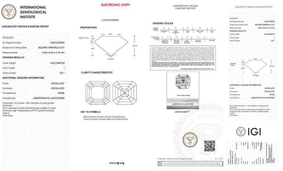 เพชรทรงอัสเชอร์ 4.45 กะรัต ผลิตในห้องปฏิบัติการ ความสะอาดระดับ VS1 สี I คุณภาพการเจียระไนยอดเยี่ยม ความแข็ง 10 โมห์ ได้รับการรับรองจาก IGI สำหรับใช้ในงานเครื่องประดับ