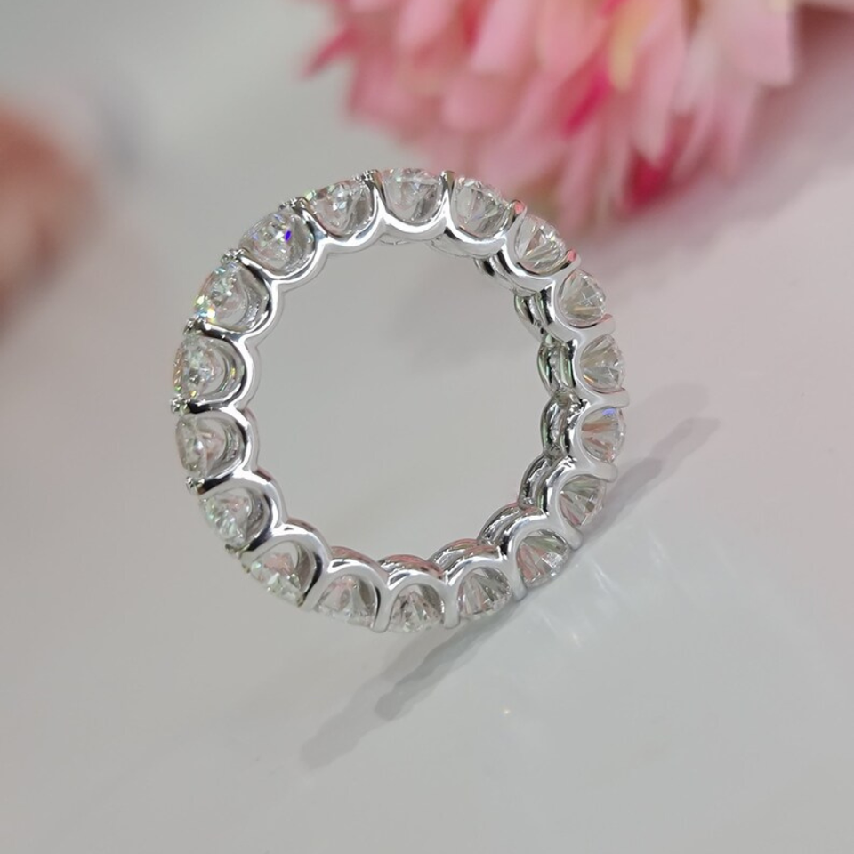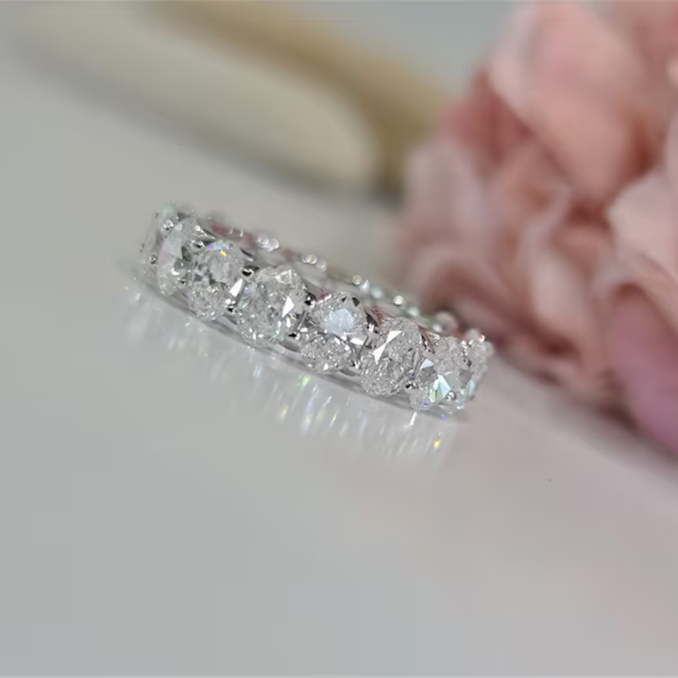 แหวนแต่งงานเพชรทรงรี 4.50 กะรัต เพชรเลี้ยงในห้องปฏิบัติการ ความใส VS สี EF ตัวเรือนทอง 14K ชุบโรเดียม สำหรับผู้หญิง ดีไซน์ทันสมัย