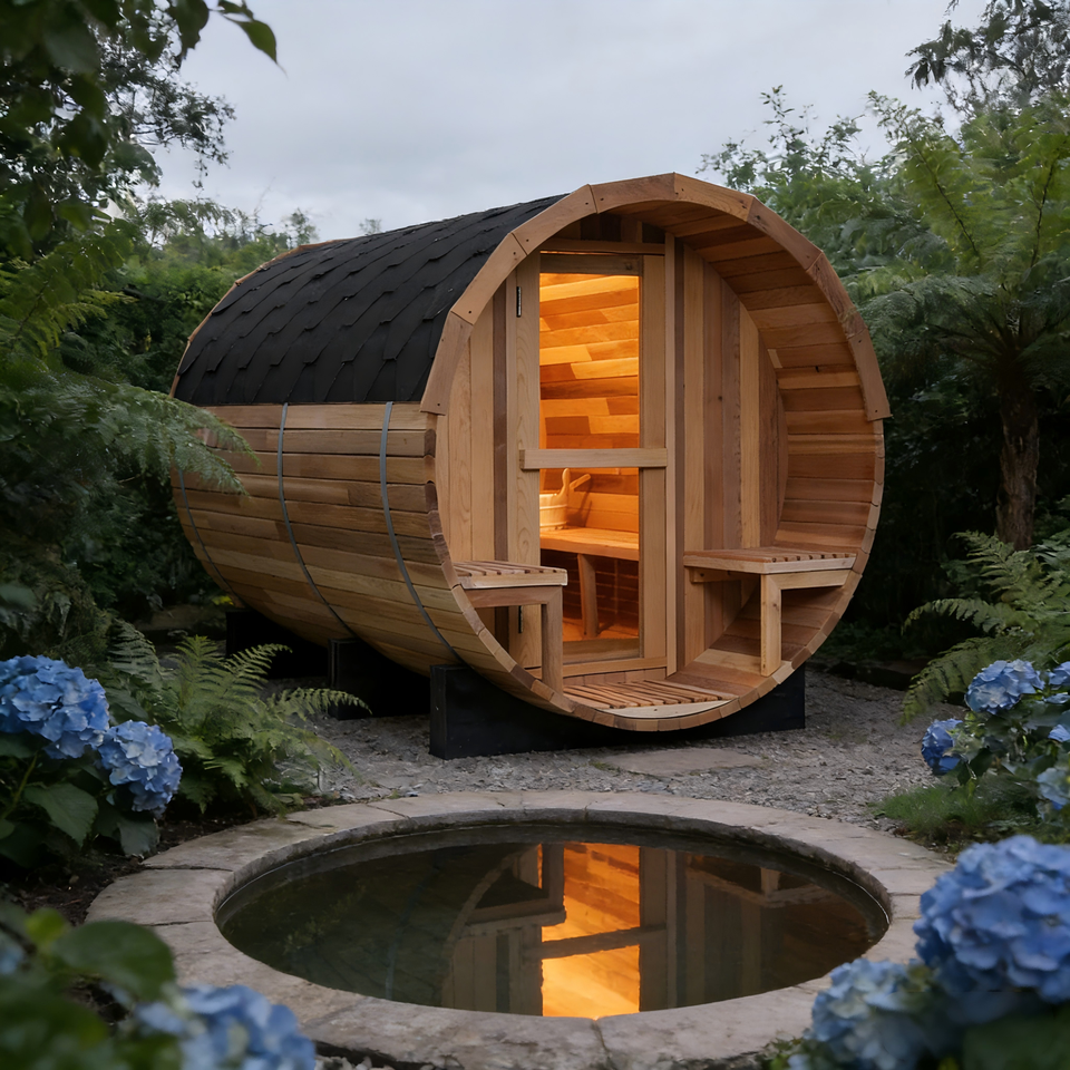 ซาวน่าแบบถังสำหรับ 4-6 คน สำหรับใช้งานกลางแจ้ง ทำจากไม้ซีดาร์แดงแบบต่อชิ้น ซาวน่าแบบดั้งเดิม