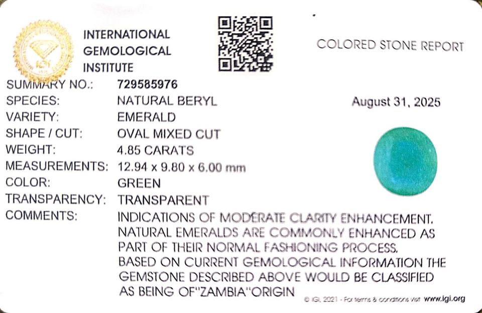 มรกตสีเขียวรูปไข่ 4.85 กะรัต จากแซมเบีย แผนภูมิพลอยราตติ 5.25
