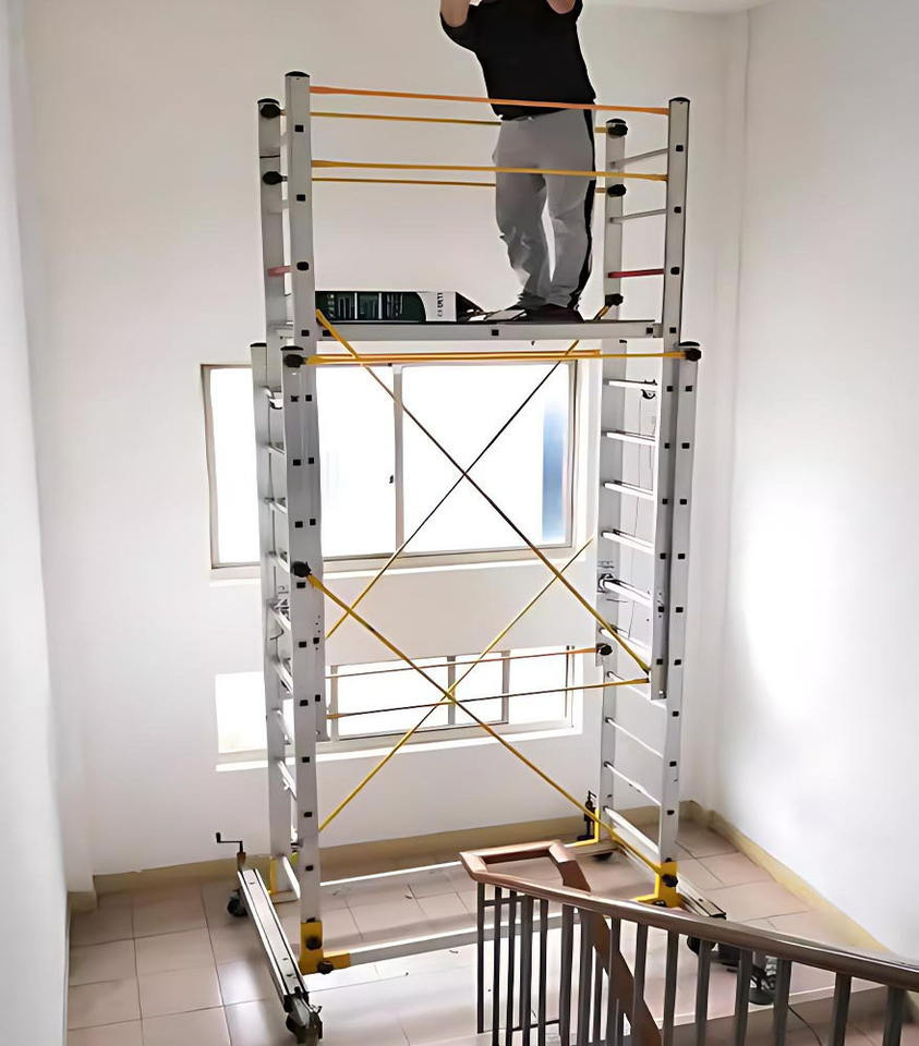 นั่งร้านอลูมิเนียมอัลลอยแบบยืดหดได้ 4-9 เมตร นั่งร้านพับได้ นั่งร้านเคลื่อนที่สำหรับงานปรับปรุงบ้าน ทนทานต่อการกัดกร่อน