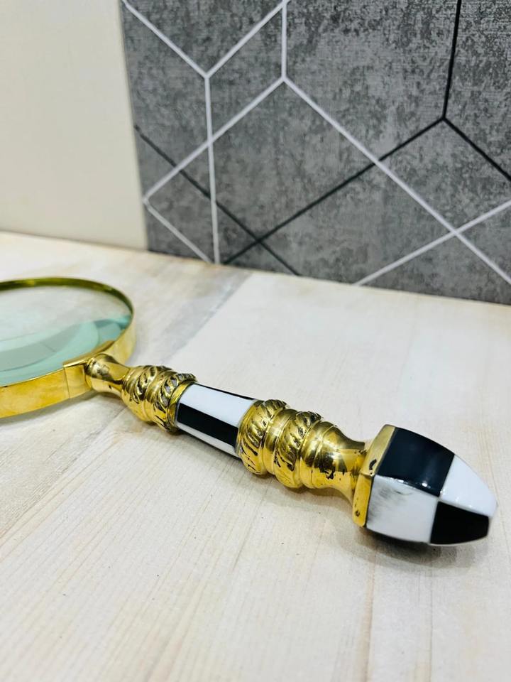 แว่นขยายมือถือทองเหลืองขนาด 4 นิ้ว พร้อมด้ามจับหินสีดำและสีขาว | แว่นขยายอ่านหนังสือแบบตกแต่ง