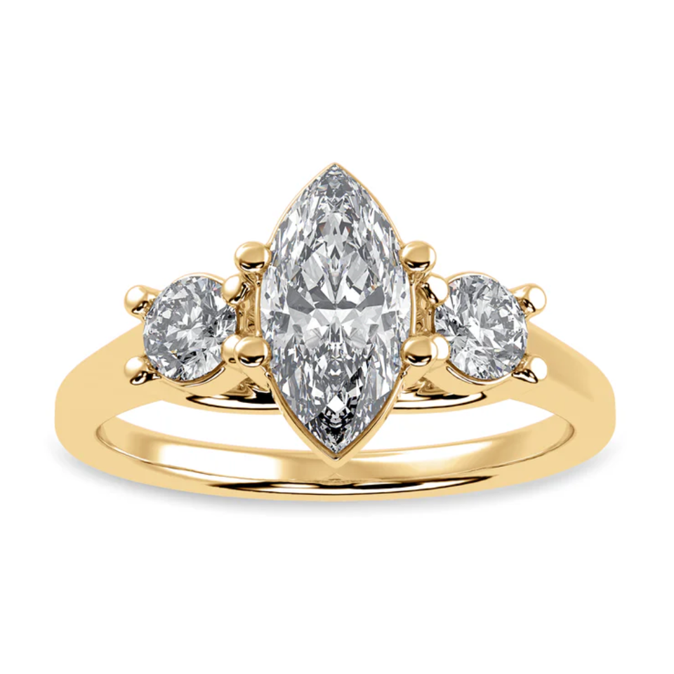 แหวนเพชรทรงมาร์คีส์และทรงกลม 4 กะรัต ได้รับการรับรองจาก IGI เพชรเพาะเลี้ยงในห้องปฏิบัติการ แหวนสามเม็ดในทองคำ 14K สี F ความใส VVS2