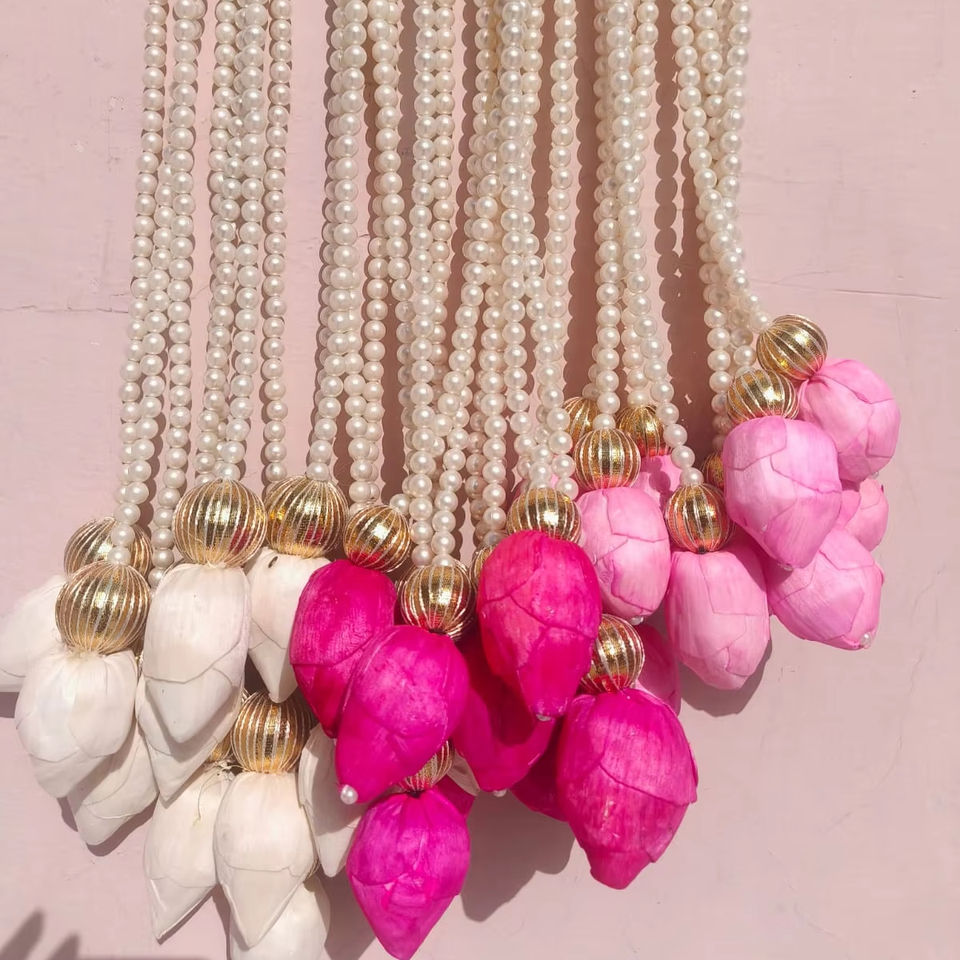 ลูกปัดห้อยประดับผนัง4ฟุตประดับด้วยพวงมาลัยดอกบัวไม้โซลียาสำหรับตกแต่งคาลยานัมและโกลู