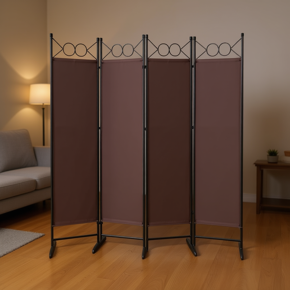 ฉากกั้นห้อง 4 บาน ขนาด 6 ฟุต สีน้ำตาล ผ้าโพลีเอสเตอร์ โครงเหล็กคาร์บอน พับได้ ดีไซน์ทันสมัย สำหรับตกแต่งบ้าน