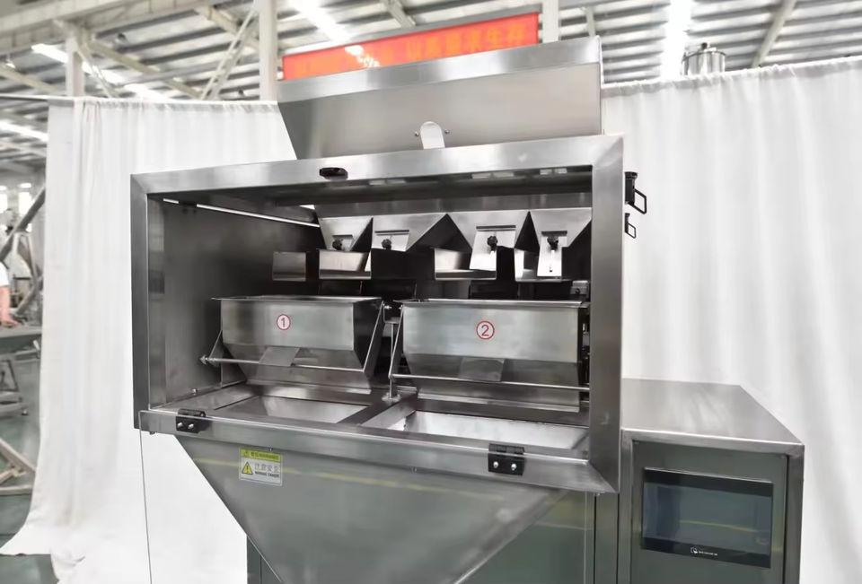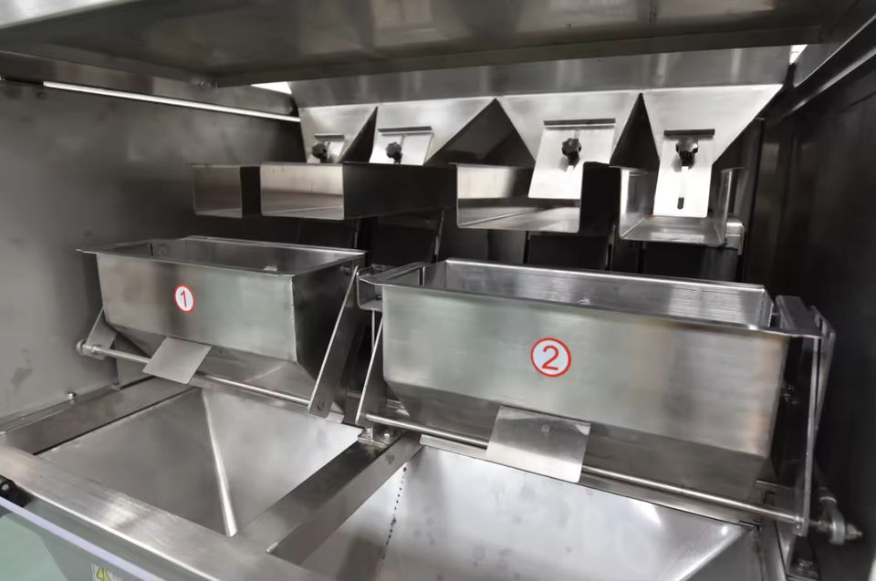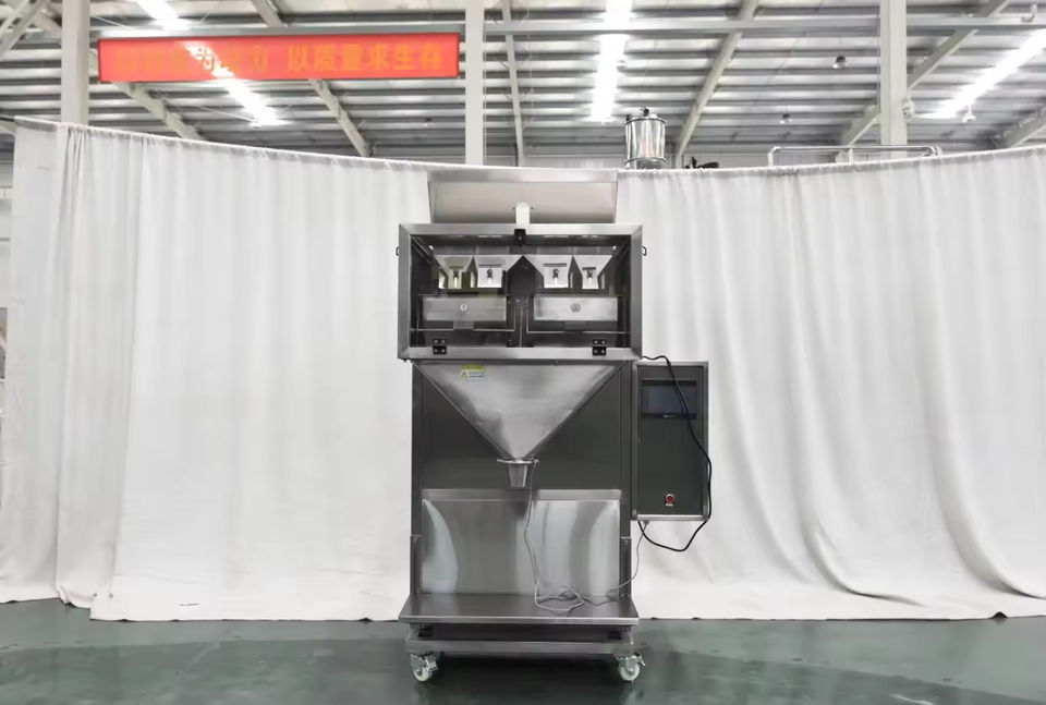 เครื่องบรรจุแบบสั่นสะเทือนเชิงเส้น 4 หัว บรรจุภัณฑ์โลหะ กึ่งอัตโนมัติ 20 ถุง/นาที สำหรับชั่งน้ำหนักถั่วลิสง