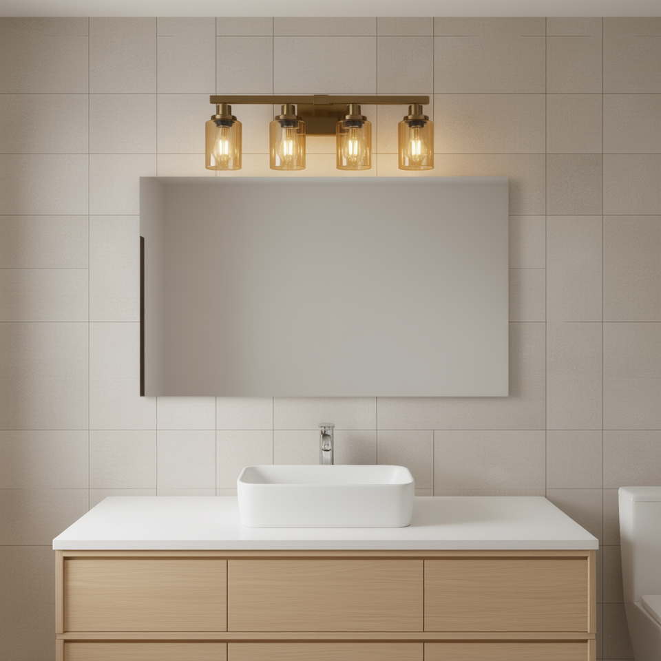 โคมไฟห้องน้ำแบบติดผนัง 4 ดวง ดีไซน์ทันสมัย สีทอง โครงโลหะ ฝาครอบกระจกใส แสง LED สีขาวอบอุ่น 2700K สำหรับกระจกแต่งหน้า