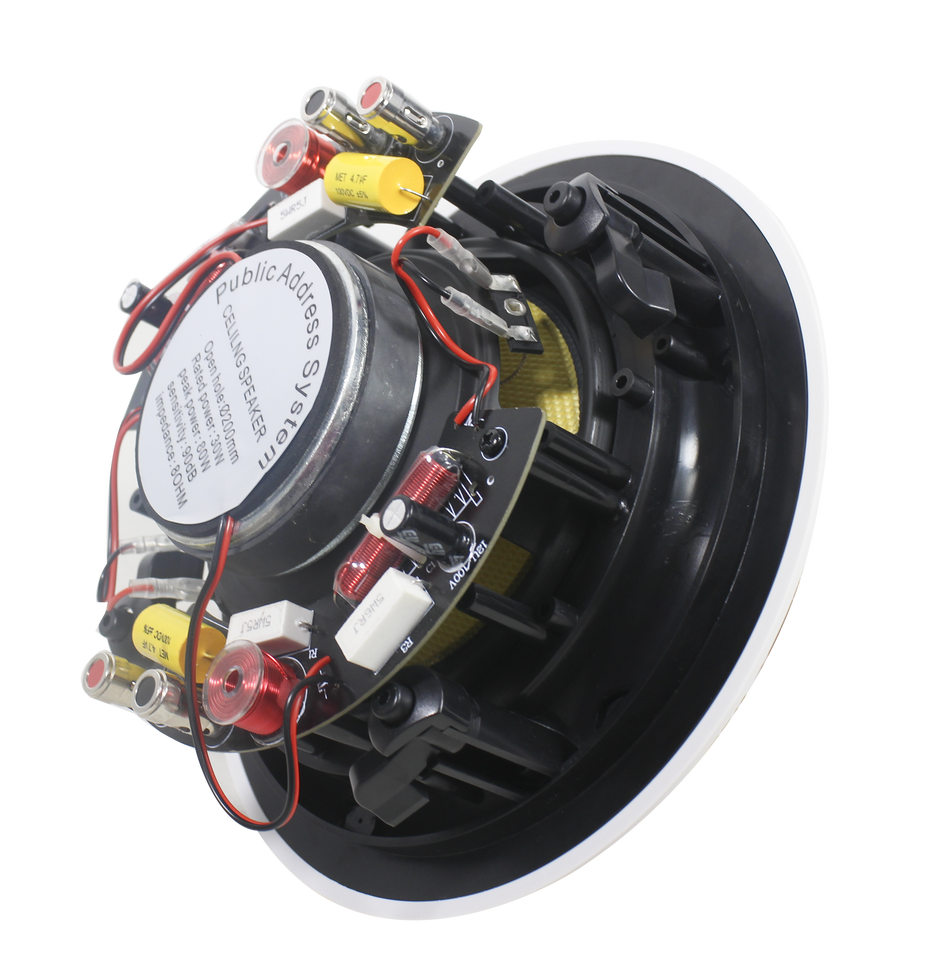 ลำโพงติดเพดานแบบไร้ขอบ ขนาด 6.5 นิ้ว 4 โอห์ม พร้อมทวีตเตอร์คู่ สำหรับโรงภาพยนตร์และห้องประกอบพิธีกรรม