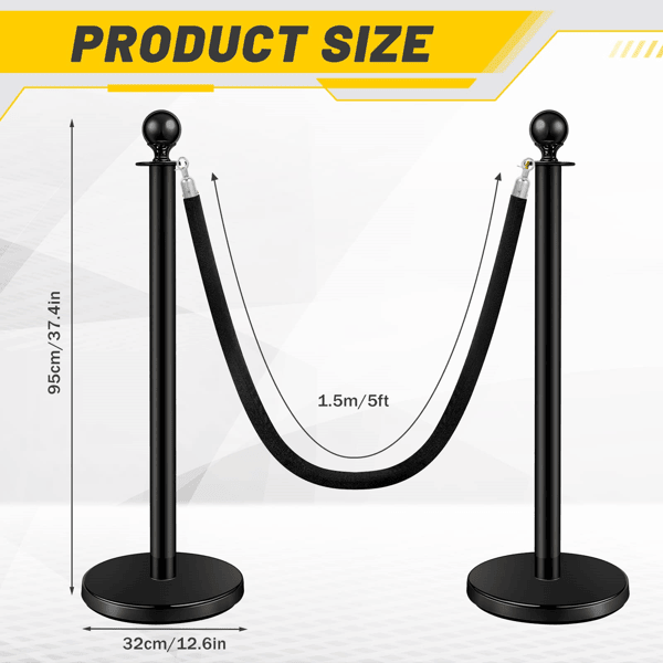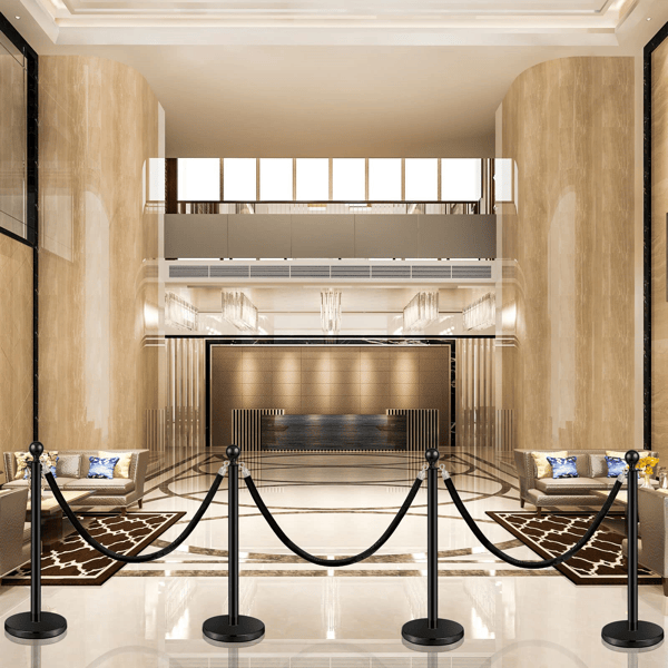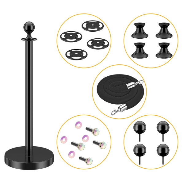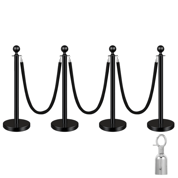 เสาคั่นฝูงชนแบบเชือกกำมะหยี่สีดำ 4 ชิ้น พร้อมฐานแบบเติมทรายสีดำ สำหรับโรงละครและงานแสดง