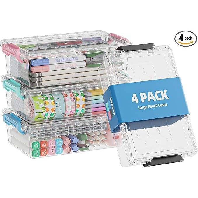 กล่องใส่ดินสอพลาสติกใสขนาดใหญ่พิเศษ 4 ชิ้น กล่องใส่สีเทียนและปากกามาร์คเกอร์ พร้อมกล่องจัดระเบียบงานฝีมือแบบซ้อนได้ หมวดหมู่สินค้าใหม่