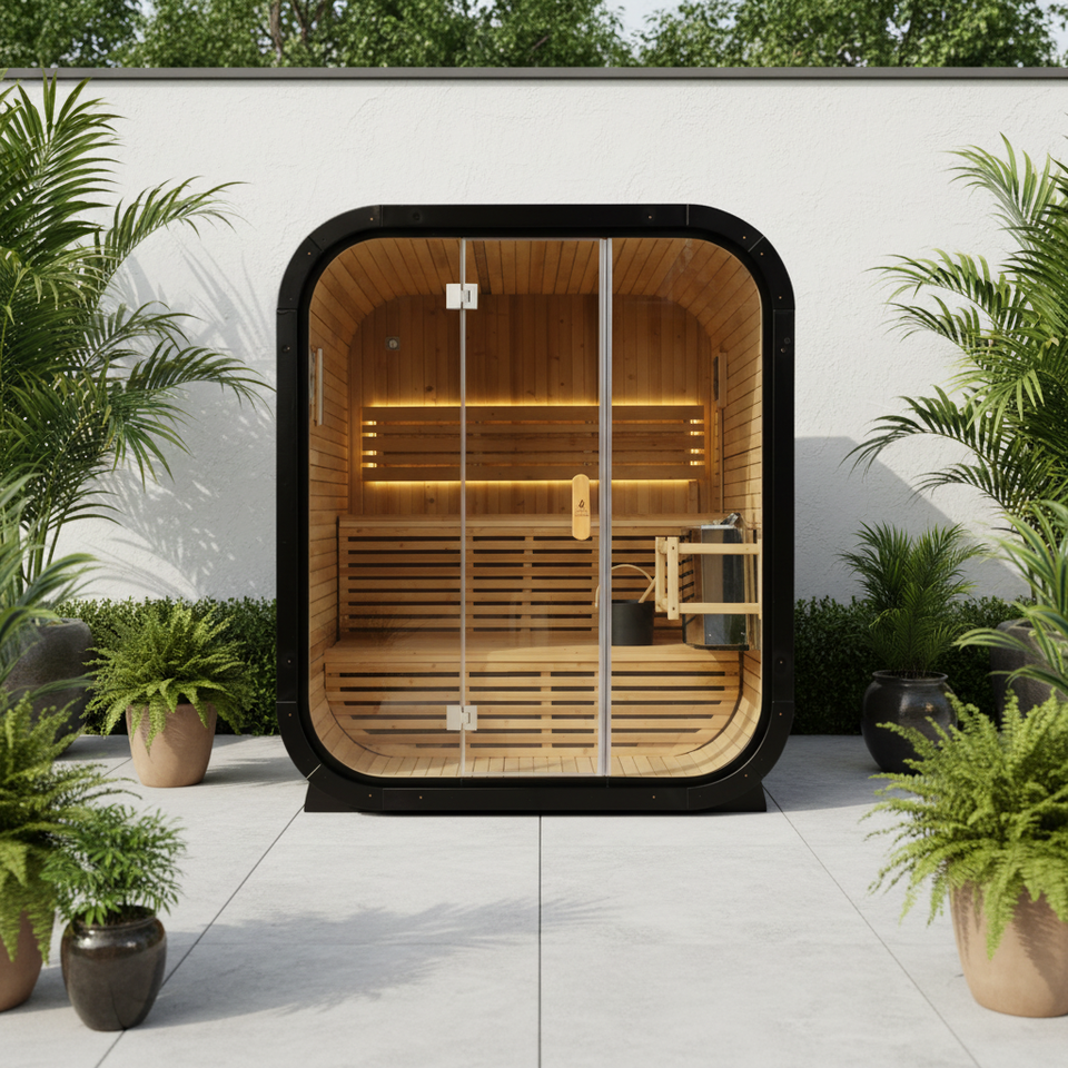 ห้องซาวน่ากลางแจ้งสำหรับ 4 คน ทำจากไม้เฮมล็อกคาร์บอนไนซ์ พร้อมกระจกทนความร้อนสูง