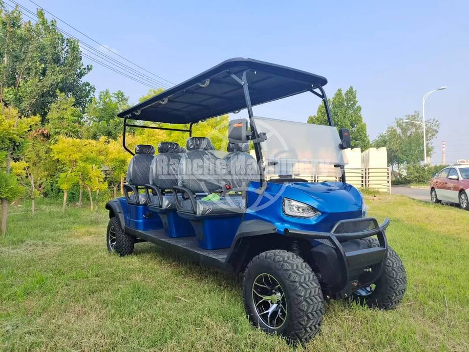 รถกอล์ฟไฟฟ้า 4 ที่นั่ง 48V แบบยกสูง สำหรับขับขี่ออฟโรด ใช้แบตเตอรี่ตะกั่วกรด ได้รับการรับรองมาตรฐาน CE ระยะทางวิ่ง 70-90 กม. สีสันปรับแต่งได้ ใช้เวลาในการชาร์จ 5-7 ชั่วโมง