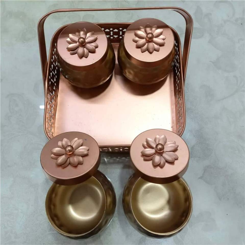 ชุดโหลใส่ผลไม้อบแห้ง 4 ชิ้น ดีไซน์หรูหราเคลือบทองแดง พร้อมหูจับรูปดอกไม้ กระปุกโลหะทำมือคุณภาพพรีเมียมสำหรับใส่เครื่องเทศและถั่ว พร้อมหูจับแบบตะกร้า