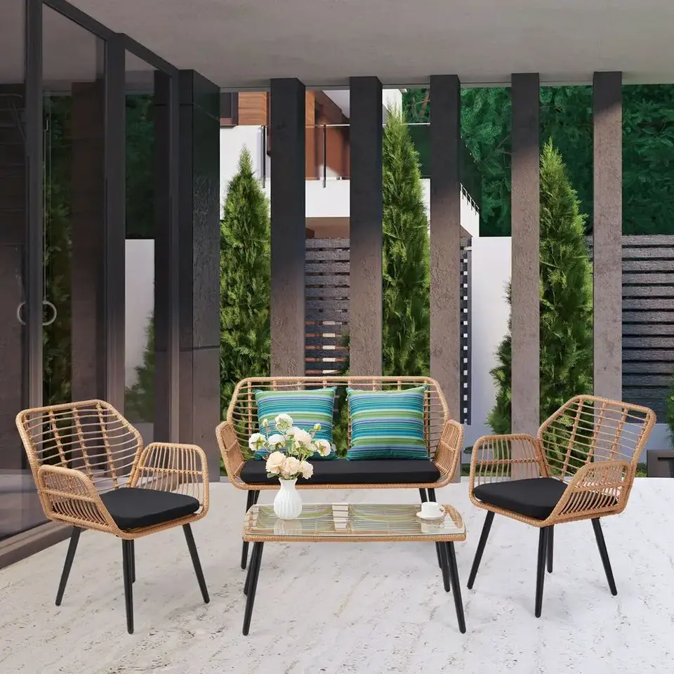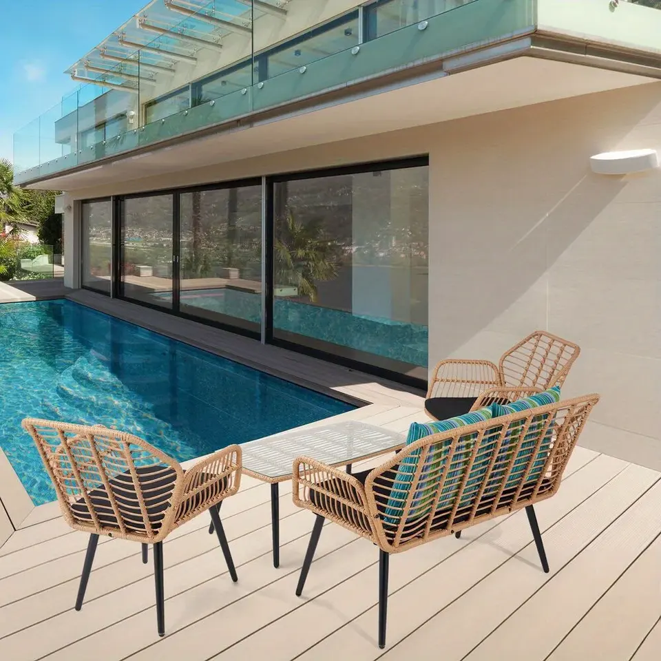 ชุดเฟอร์นิเจอร์4ชิ้นเก้าอี้โซฟาหวาย PE หวายลานริมสระน้ำกลางแจ้ง