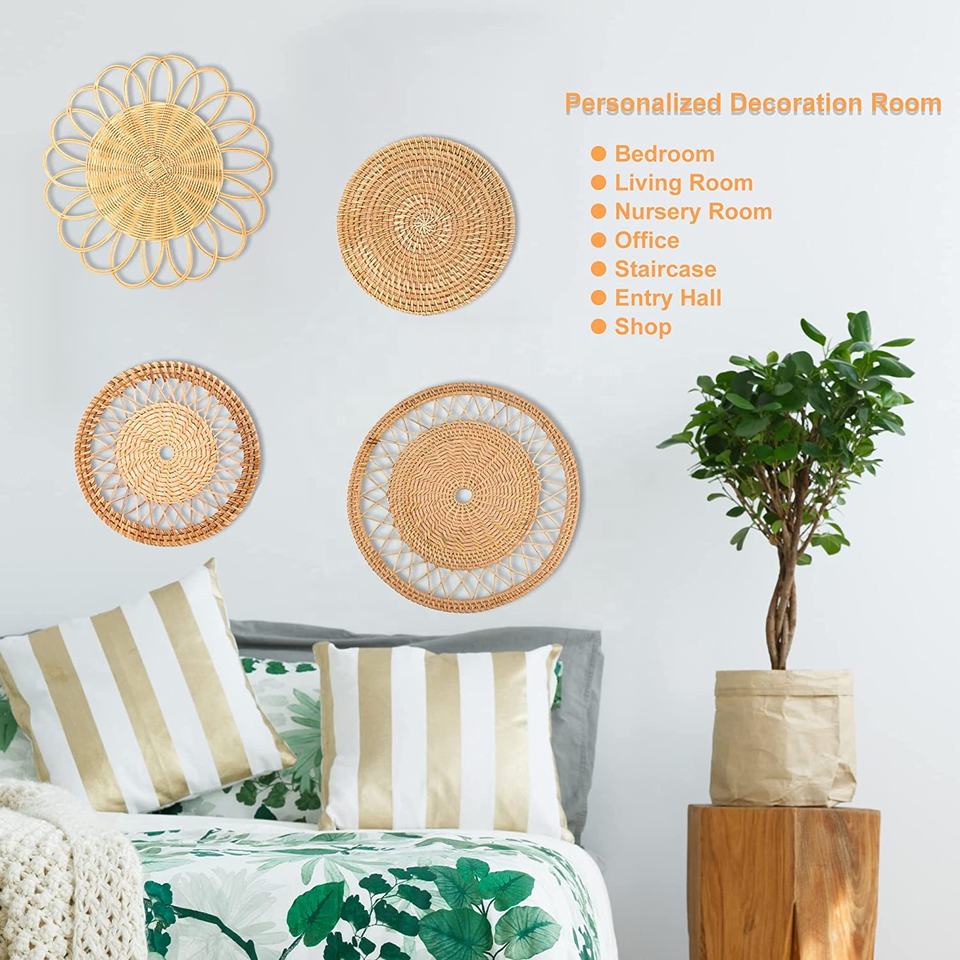 ตะกร้าหวายติดผนัง4ชิ้นสำหรับตกแต่ง,ตะกร้าแขวนผนังแบบแฮนเมดตะกร้าสานแบบแบนโบโฮทรงกลมถาดหวายสำหรับตกแต่งผนังแนวชนบท