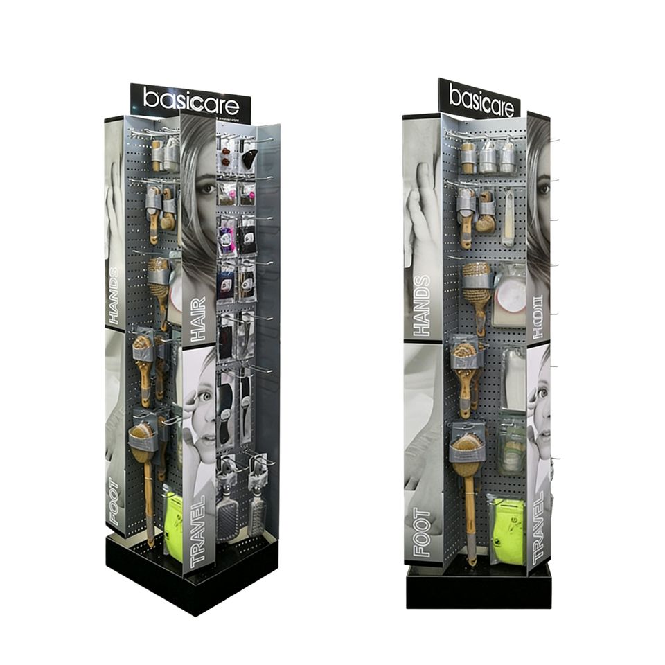 ชั้นวางโลหะหมุนได้ 4 ด้าน พร้อมแผ่นเพ็กบอร์ดและตะขอ ชั้นวางแบบโมดูลาร์สำหรับแปรงแต่งหน้า หวีผม อุปกรณ์ร้านเสริมสวย