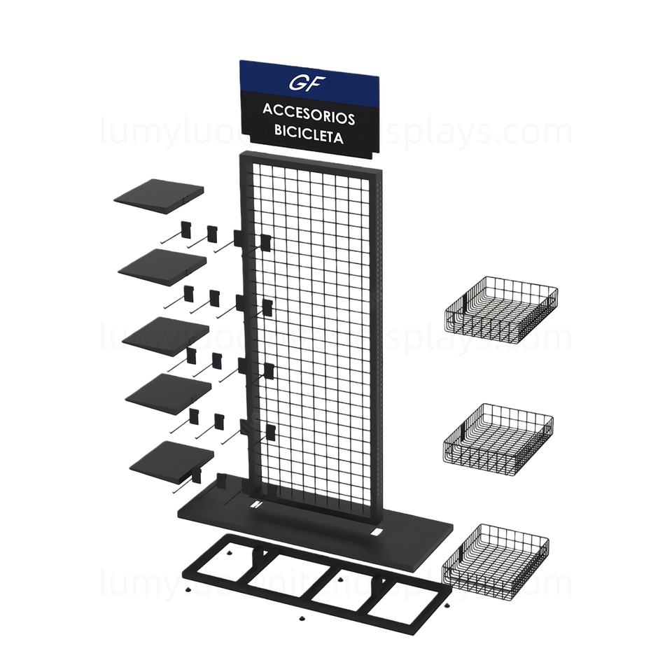 ชั้นวางสินค้าโลหะ 4 ด้าน พร้อมชั้นวาง ตะขอ ตะกร้าลวดตาข่าย สำหรับอะไหล่จักรยาน อุปกรณ์กีฬากลางแจ้ง ร้านค้าปลีก