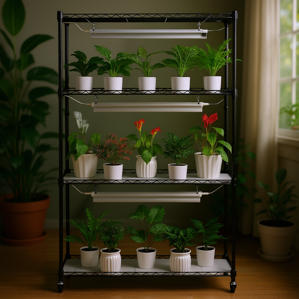 ชั้นวางต้นไม้ในร่ม 4 ชั้น 90W ฟูลสเปกตรัม พร้อมชั้นวางไฟปลูกแบบปรับได้ สำหรับสวนในบ้านและการเพาะเมล็ด