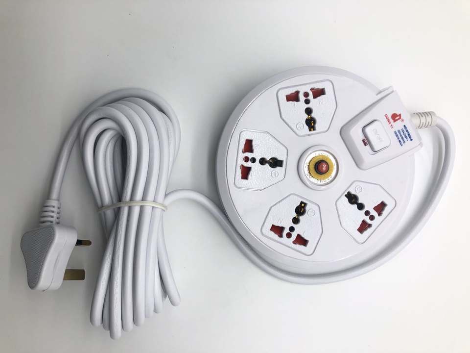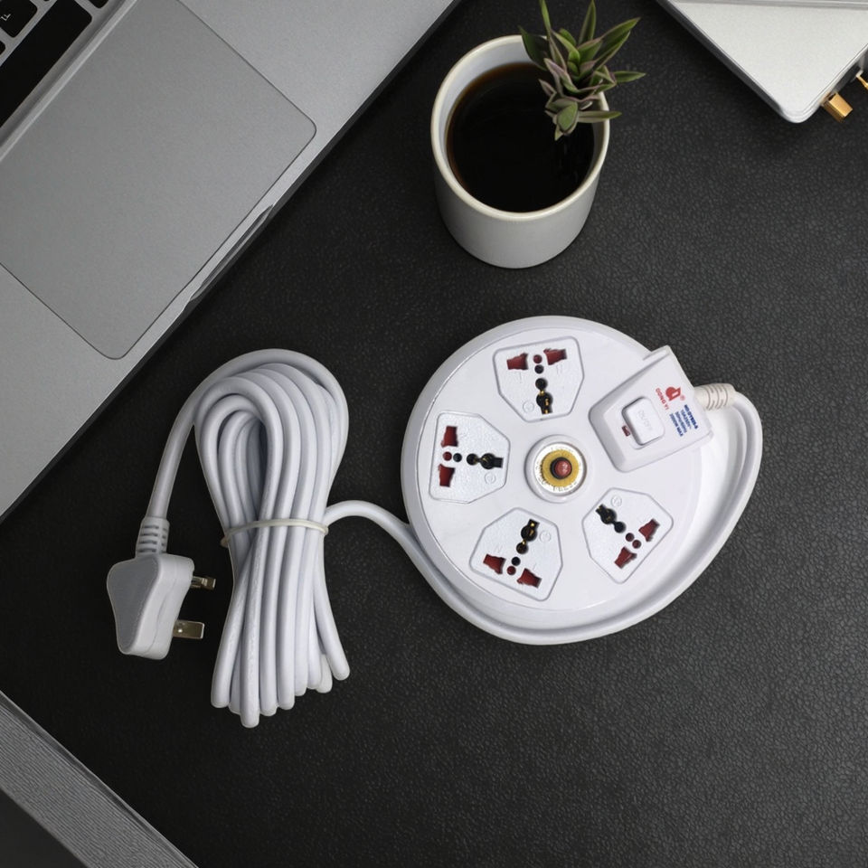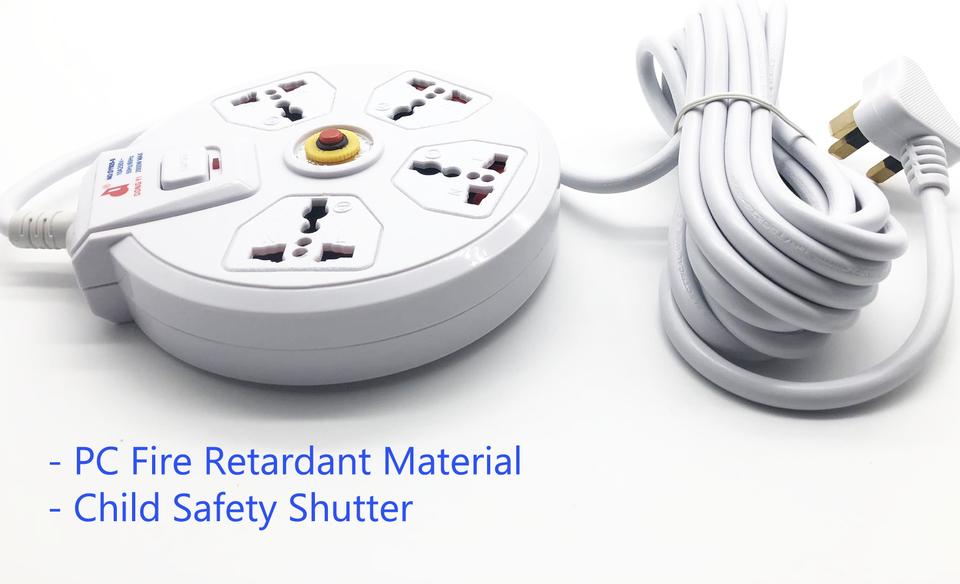 ปลั๊กไฟต่อพ่วงแบบปรับแต่งได้พร้อมปุ่มตรงกลาง มี 4 ช่องเสียบ รองรับปลั๊กไฟสากล