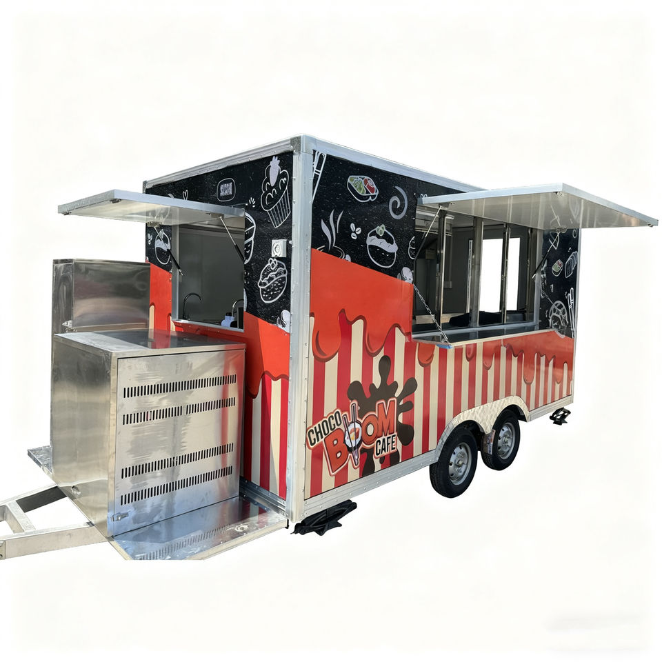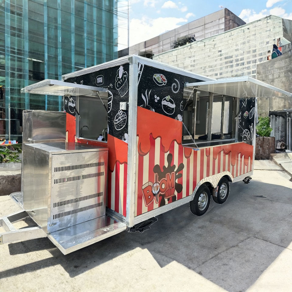 รถเข็นขายอาหารเคลื่อนที่อเนกประสงค์ 4 ล้อ ทำจากสแตนเลส สำหรับขายไอศกรีม ฮอทดอก และอาหารจานด่วน มีหน้าต่างขนาดใหญ่ เหมาะสำหรับการค้าขายกลางแจ้ง