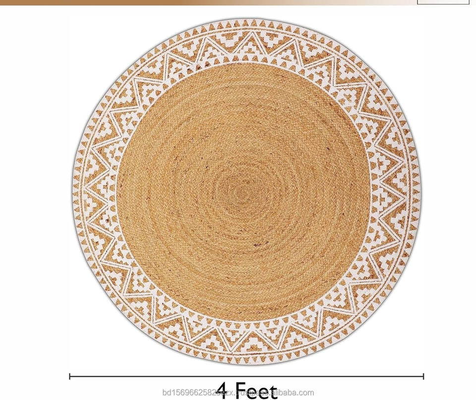 พรมปอกระเจาทอมือแบบดั้งเดิมขนาด 4 ฟุต ขอบพิมพ์ลายสีขาว ทนต่อคราบสกปรก ขนยาว ป้องกันสัตว์เลี้ยง ผลิตด้วยมือ ป้องกันแบคทีเรีย เหมาะสำหรับการเดินทาง