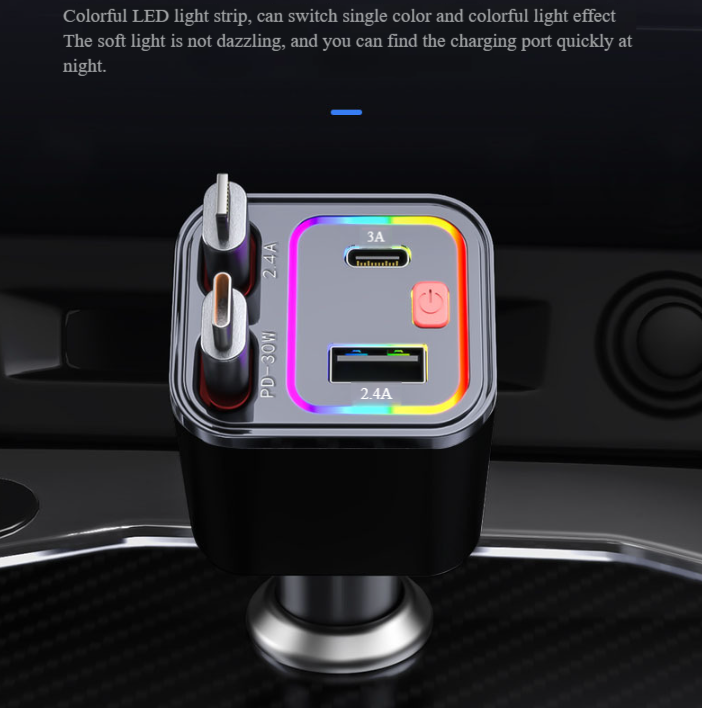 ที่ชาร์จในรถ4อิน1แบบพับเก็บได้มีไฟแวดล้อมอะแดปเตอร์ในรถ USB C ชาร์จเร็วมากสำหรับที่จุดบุหรี่