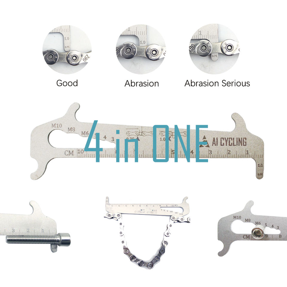 เครื่องมือตรวจสอบโซ่จักรยาน4ใน1สแตนเลสพร้อมตัวบ่งชี้การสึกหรอการวัดโซ่ตะขอเกี่ยว