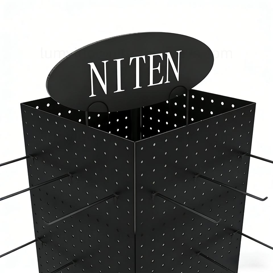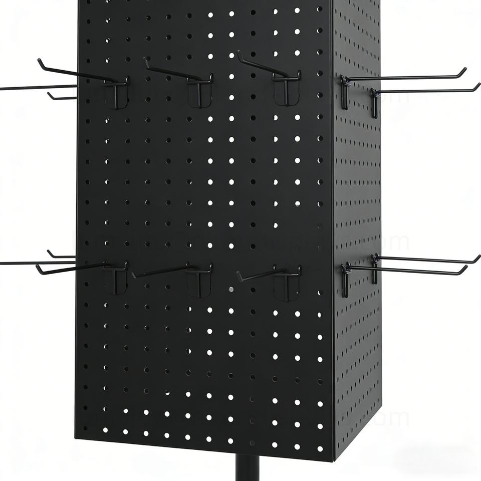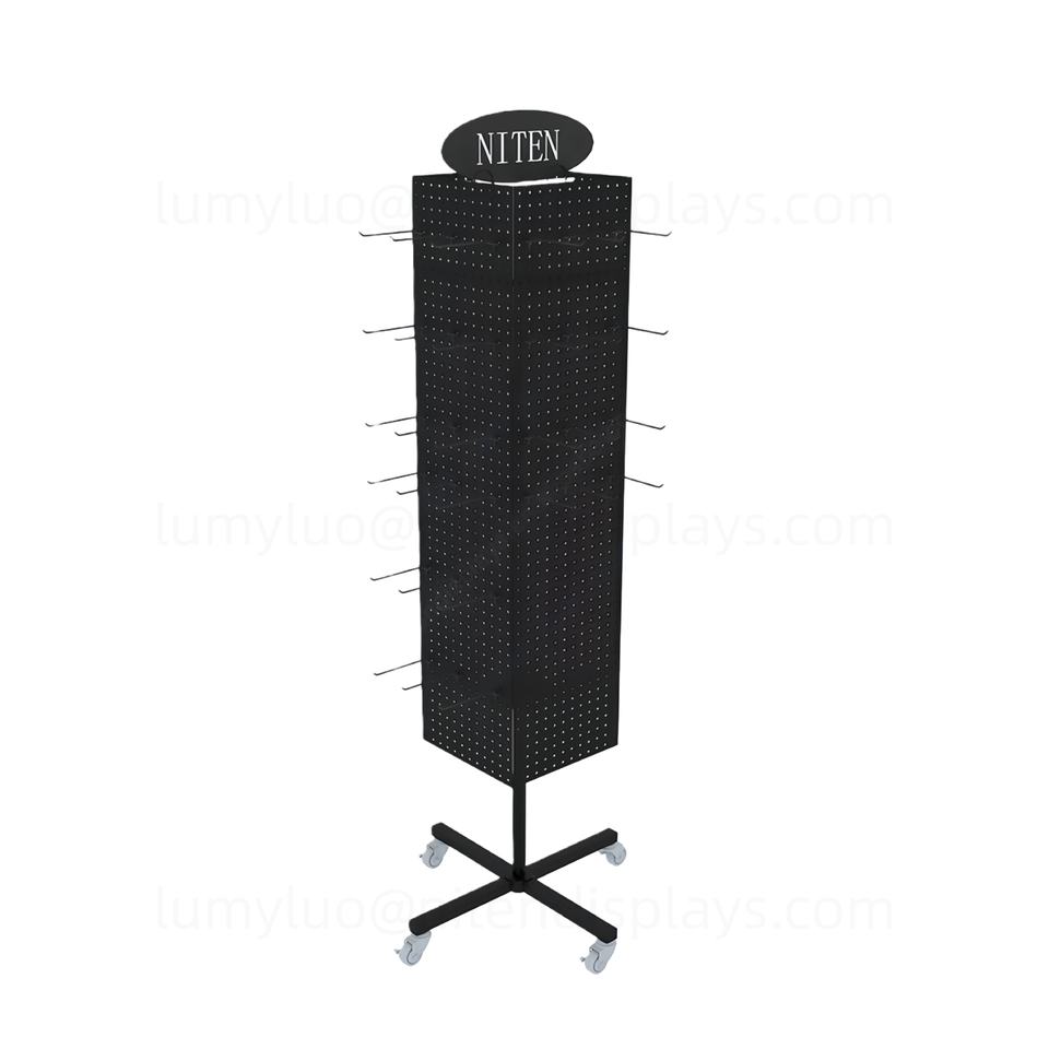 ชั้นวางสินค้าหมุนได้ 4 ด้าน พร้อมล้อ แผ่นเพ็กบอร์ด และตะขอ สำหรับเครื่องสำอางและแปรงแต่งหน้า ชั้นวางสินค้าหมุนได้ทำจากโลหะ