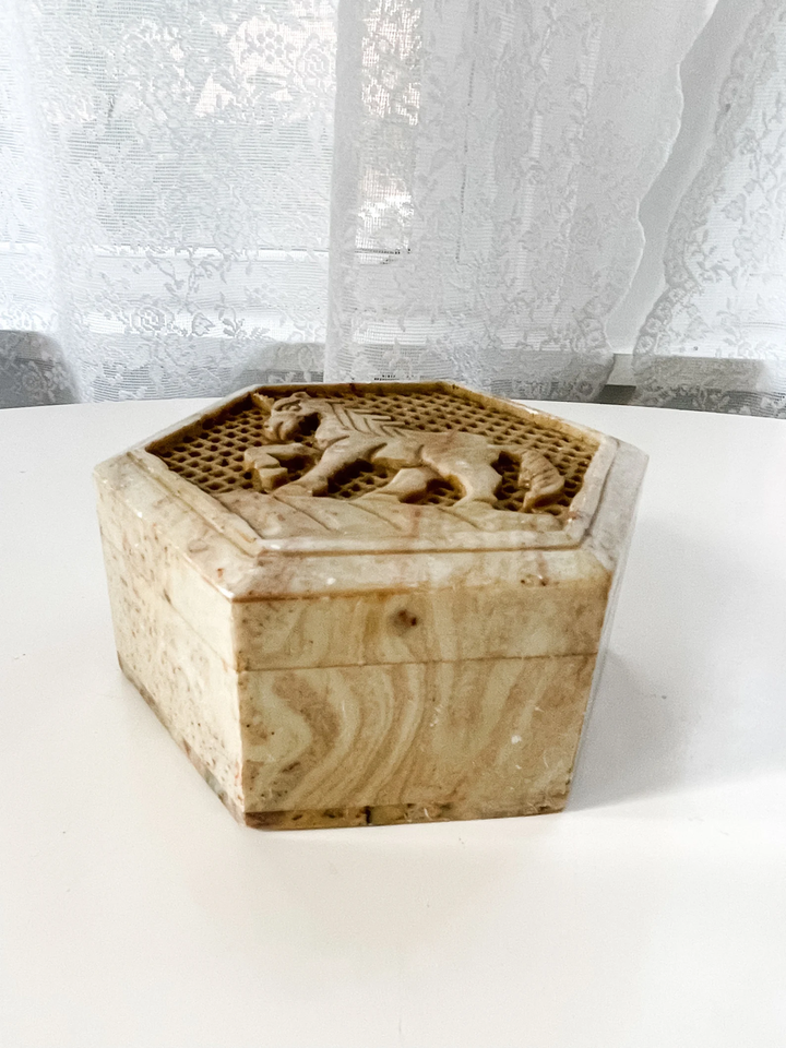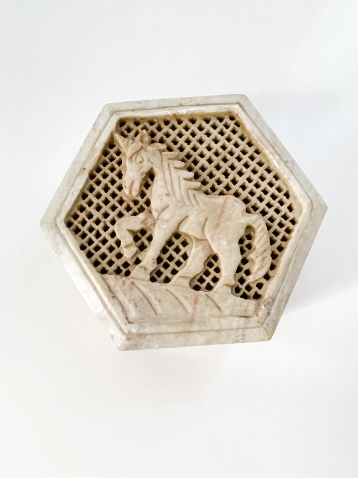 กล่องใส่เครื่องประดับและของจุกจิกหกเหลี่ยมลายยูนิคอร์นทำมือจากหินสบู่หินอ่อนวินเทจ ขนาด 4"x4"x2" ของขวัญสุดหรูทันสมัยสำหรับเธอ