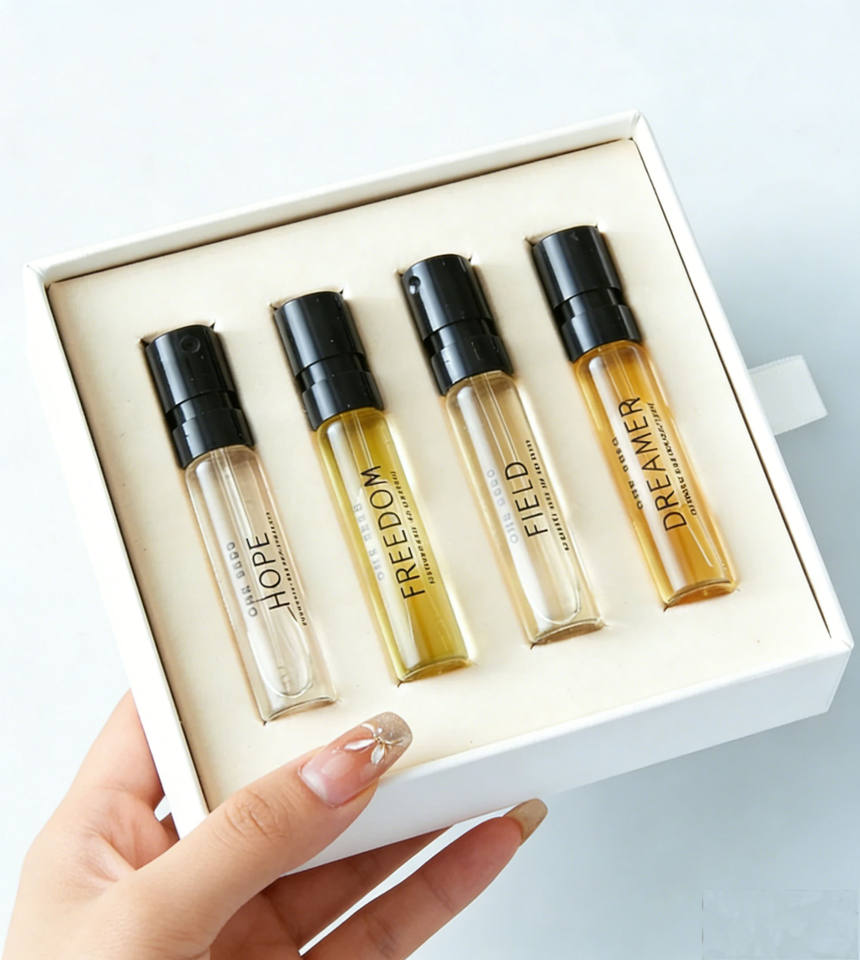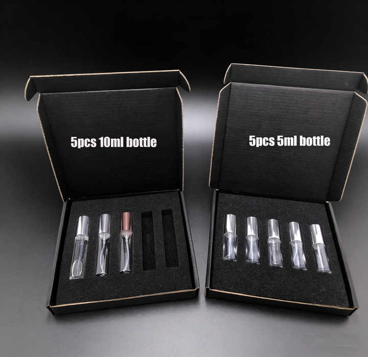 กล่องบรรจุภัณฑ์สีดำสุดหรูสำหรับชุดของขวัญน้ำหอมตัวอย่างขนาด 5 มล. จำนวน 5 ชิ้น ผลิตจากวัสดุรีไซเคิล พร้อมฟองน้ำบุภายใน