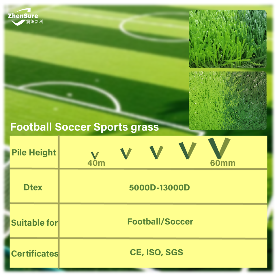 หญ้าเทียมสำหรับฟุตบอลระดับมืออาชีพ ขนาด 40-60 มม. ปรับความหนาแน่นและสีได้ สำหรับสนามฝึกซ้อมและสนามแข่งขัน ผลิตจากโพลีเอทิลีนคุณภาพสูง