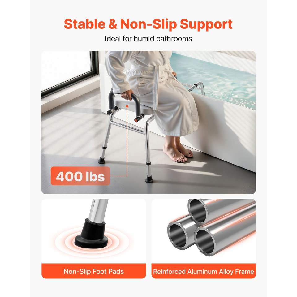 เก้าอี้อาบน้ำแบบเลื่อนน้ำหนักได้ 400 ปอนด์ พร้อมที่นั่งหมุนได้ ม้านั่งสำหรับเข้าอ่างอาบน้ำ และพนักพิงแขนปรับหมุนได้ อุปกรณ์เพื่อความปลอดภัยในห้องน้ำ