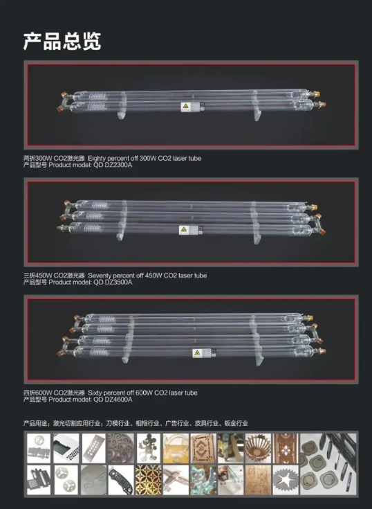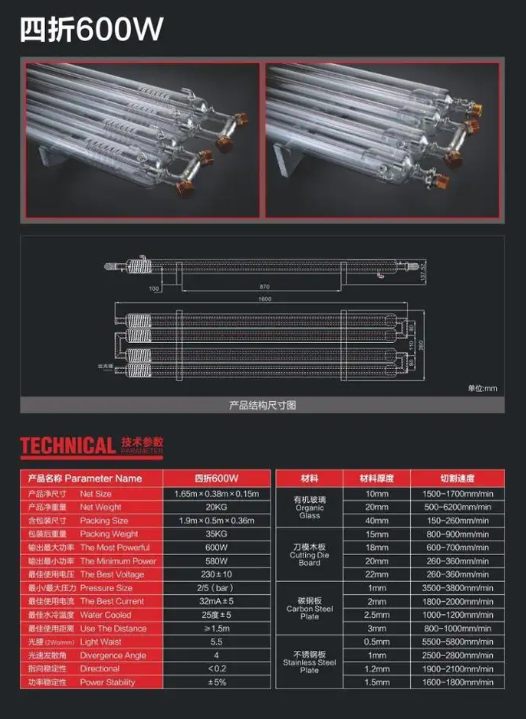 หลอดเลเซอร์ Co2 400W & 600W สำหรับเครื่องตัดเลเซอร์ Die Board อุปกรณ์เลเซอร์พลังงานสูง